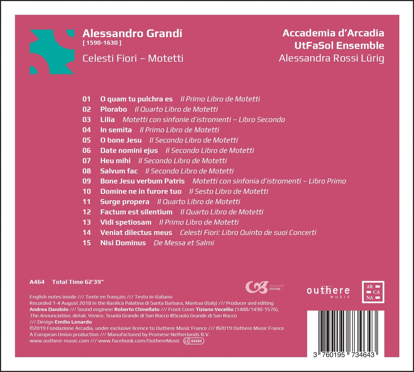 Alessandro Grandi (born in Venice in 1590), regarded by scholars as “the greatest motet composer of his time,” was a prominent figure of the new Venetian style in the first half of the seventeenth century. An extremely precocious talent, he was considered by his contemporaries equal to Claudio Monteverdi, to whom he was appointed deputy in 1627 in Saint Mark’s Basilica. Yet our knowledge of his life and musical output is scanty, and thus he has remained mostly undiscovered. “Celesti fiori” (celestial flowers), a title taken from his Fifth Book of Motets, is the first complete monograph recording dedicated to this important composer. It consists of a selection of works, almost all recorded here for the first time, chosen from his books of motets, all published between 1610 and 1630, the year in which he was killed by the plague, along with his large family. Recorded in the extraordinary acoustics of the Basilica di Santa Barbara in Mantua, where Monteverdi worked during his long stay in the city, this project features the splendid voices of the Accademia d’Arcadia, an ensemble recently founded in 2018 for the purpose of performing Italian music of the seventeenth century.