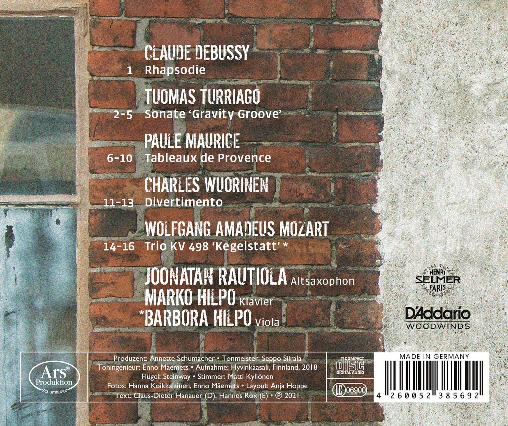 The saxophone, especially the alto saxophone, is not necessarily a very busy instrument in the symphony orchestra. However, in addition to its formative tracks in jazz, in quite a few cases it has also left sound traces in the field of so-called ""classical music"" that are worth listening to. These traces are followed by the album ""Gravity Groove"" by the Finnish saxophonist Joonatan Rautiola. In addition to an interesting arrangement detour to Mozart's ""Kegelstatt Trio"", it also brings to life impressionistic or neo-classical gems such as Claude Debussy's Rhapsody for Alto Saxophone and Paule Maurice's Tableaux de Provence. With Charles Wuorinen's Divertimento and the title sonata by Tuomas Turriago, ""Gravity Groove"", Rautiola enters contemporary sound spheres with virtuosity and tonal refinement.