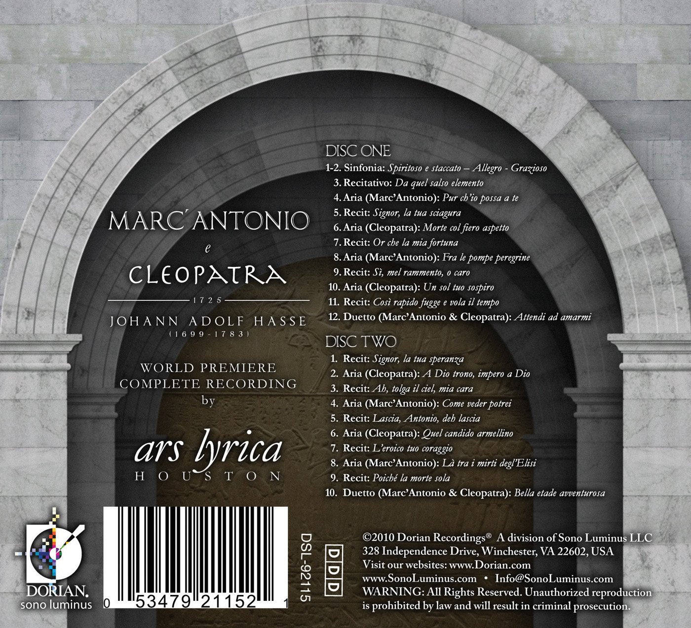 Dorian Sono Luminus invites you to a night at the opera with this 2 CD release of Adolf Hasse’s serenata Marc’Antonio e Cleopatra, performed by the Houston-based ensemble Ars Lyrica. Founded in 1998 by harpsichordist and conductor Matthew Dirst, Ars Lyrica Houston has begun to make a name for itself in the international early music community. Gramophone recently praised Ars Lyrica’s début CD (A SCARLATTI Euridice dall'Inferno, La Concettione della Beata Vergine Naxos 8.570950) for its ‘exemplary skill and taste’, the ensemble’s musicians for their ‘impassioned performance’. In 1721 Johann Adolf Hasse traveled to Italy to hone his craft and seek his fortune. Settling in Naples, Hasse studied composition first with Nicola Porpora, then Alessandro Scarlatti, and began to write seriously for the stage. By 1730 he produced at least seven operas, eight intermezzi, and three serenate, the most significant of which is Marc’Antonio e Cleopatra. Hasse’s score makes vivid the complex emotions of his title characters in eight arias, two duets, and some highly expressive recitative; the whole is introduced by a Sinfonia in two movements. Though the work is scored for just strings and continuo, this recording adds various woodwind colors (oboes, recorders, flute, and bassoon), rendering even more colorful Hasse’s imaginative and supple ideas. This 2-CD set will enchant the early music community, thrill the opera lover, and intrigue all lovers of classical music.