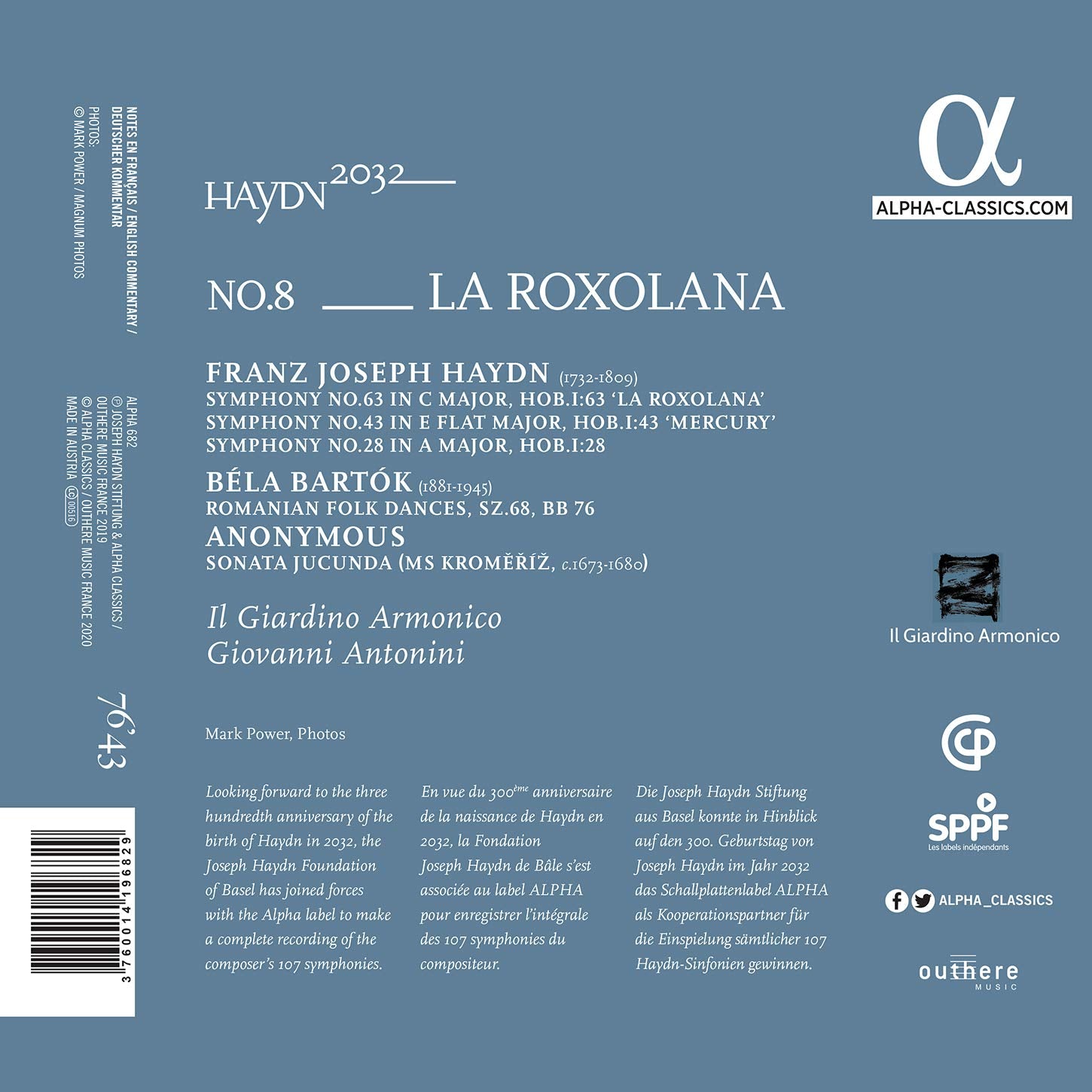 For its eighth volume, Haydn2032 invites us on a musical journey that takes the Balkan route. Of all the ‘Viennese Classical School’, Joseph Haydn is certainly the composer closest to folk music, first because he spent his early years in the countryside and also because, unlike his colleagues who worked in the urban centres of the Habsburg monarchy, Haydn was in contact with Croats, Roma and Hungarians throughout his life. These influences were omnipresent in his music, to the delight of Prince Nikolaus I Esterházy and his guests, but by some accounts were not to the taste of many music theorists in Germany. Haydn gave his Symphony no.63 in C major the title of ‘La Roxolana’, from the famous sixteenth-century sultana who was the wife of Suleiman the Magnificent after having been his slave. As usual, Giovanni Antonini, who is reunited here with Il Giardino Armonico, juxtaposes Haydn’s music with that of another composer. The natural choice here was Béla Bartók, who is represented by his Romanian Folk Dances, composed in 1917.