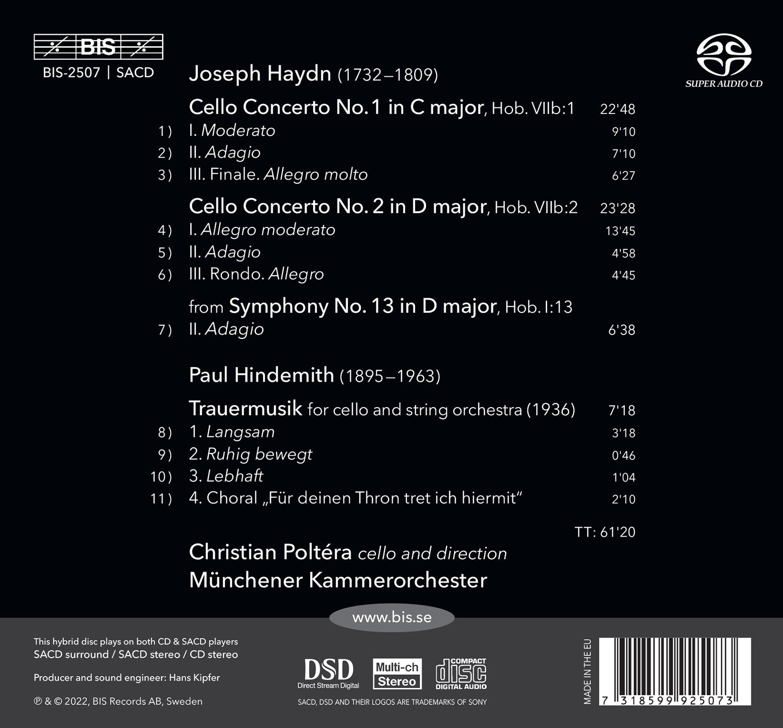 These two jewels in the cello repertoire are here performed by the acclaimed Swiss cellist Christian Poltéra who also directs the Münchener Kammerorchester. Closing the disc is a work composed some 150 years later: the composer and viola player Paul Hindemith wrote his Trauermusik for himself to perform at a concert commemorating the death of George V of England in 1936. It is here heard in the version for cello and strings.