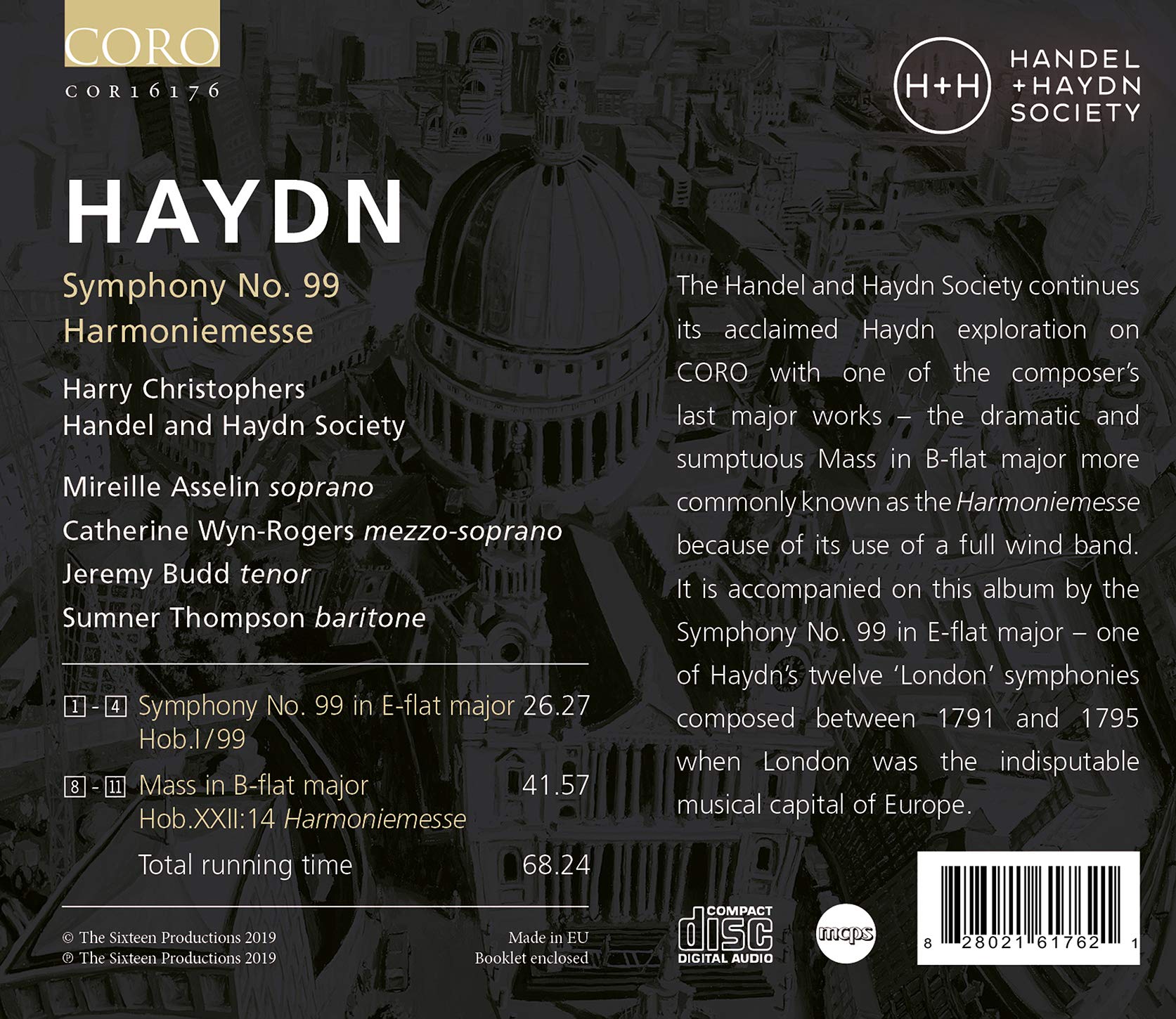 The Handel and Haydn Society continues its acclaimed Haydn exploration on CORO with one of the composer's last major works - the dramatic and sumptuous Mass in B-flat major more commonly known as the ‘Harmoniemesse’ because of its use of a full wind band. It is accompanied on this album by the Symphony No. 99 in E-flat major - one of Haydn’s twelve ‘London’ symphonies composed between 1791 and 1795 when London was the indisputable musical capital of Europe. Handel and Haydn Society is America's oldest continuously operating arts organisation. Harry Christophers has been Artistic Director since 2008 during which time the Society has released 12 recordings on CORO including Haydn’s Creation, all six of his ‘Paris’ Symphonies, Mozart’s Requiem and Handel’s Messiah, and a Christmas album - ‘Joy to the World’ - celebrating America’s favourite festive tunes.