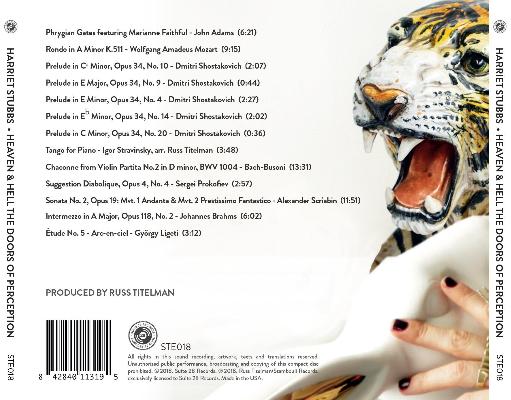 Harriet Stubbs writes of her new release: “This album is based on the concept of The Doors of Perception and a marriage of contraries. It is a presentation of Classical Music through the lens of multi-Grammy award winning producer Russ Titelman and is a reimagining of traditional classical repertoire. The album has a clear narrative running parallel to a Blakean understanding of transcendence. In Blakean philosophy we enter life in a state of innocence at childhood and dwell within that realm until we experience; at which point our perception is altered. The state of Experience and the journey from Innocence to Experience is mirrored by the first half of the album’s repertoire. There are clear states of innocence in the Brahms and the Chopin, there is lightness to the Stravinsky with our rearrangement of it. We enter Experience at the middle of the album with the Bach Busoni Chaconne in D minor. The rest of the album is a journey through the doors of perception to reach the Blakean state of higher innocence which is a combination of Innocence and Experience. It is a chosen realm of living, reached through the doors of perception and having removed our mind forged manacles which in this case are our perceptions of how classical music is displayed and understood. Life and death, light and dark, are here brought together and spiral around each other lifting us to our goal that is a marriage of the two contrary states of the human soul. D minor as a key is often associated with death and demonic spirit and is the key of the Prokofiev Diabolical Suggestions, yet the Scriabin reaches E major, well associated with heaven. Even geographically E major and D minor couldn’t be closer together melocially, yet harmonically are the absolute opposite. The album ends with plates that I curated to form the explanation in text that Marianne Faithful reads over John Adam’s Phrygian Gates, the gates are being used synonymously with doors in order to take the listener through that transition.”