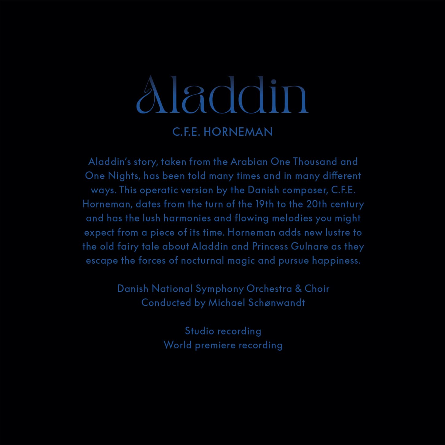 Aladdin’s story, taken from the Arabian One Thousand and One Nights, has been told many times and in many different ways. This operatic version by the Danish composer, C.F.E. Horneman, dates from the turn of the 19th to the 20th century and has the lush harmonies and flowing melodies you might expect from a piece of its time. Horneman adds new lustre to the old fairy tale about Aladdin and Princess Gulnare as they escape the forces of nocturnal magic and pursue happiness.