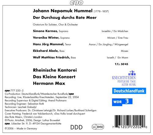 HUMMEL Der Durchzug durchs Rote Meer • Hermann Max, cond; Simone Kermes (sop); Veronika Winter (sop); Hans Jörg Mammel (ten); Ekkehard Abele (bs); Wolf Matthias Friedrich (bs); Rheinische Kantorei; Das Kleine Konzert • cpo 777 220 (50:45 &) Live: Klosterbasilike Knechtsteden 9/22/2004