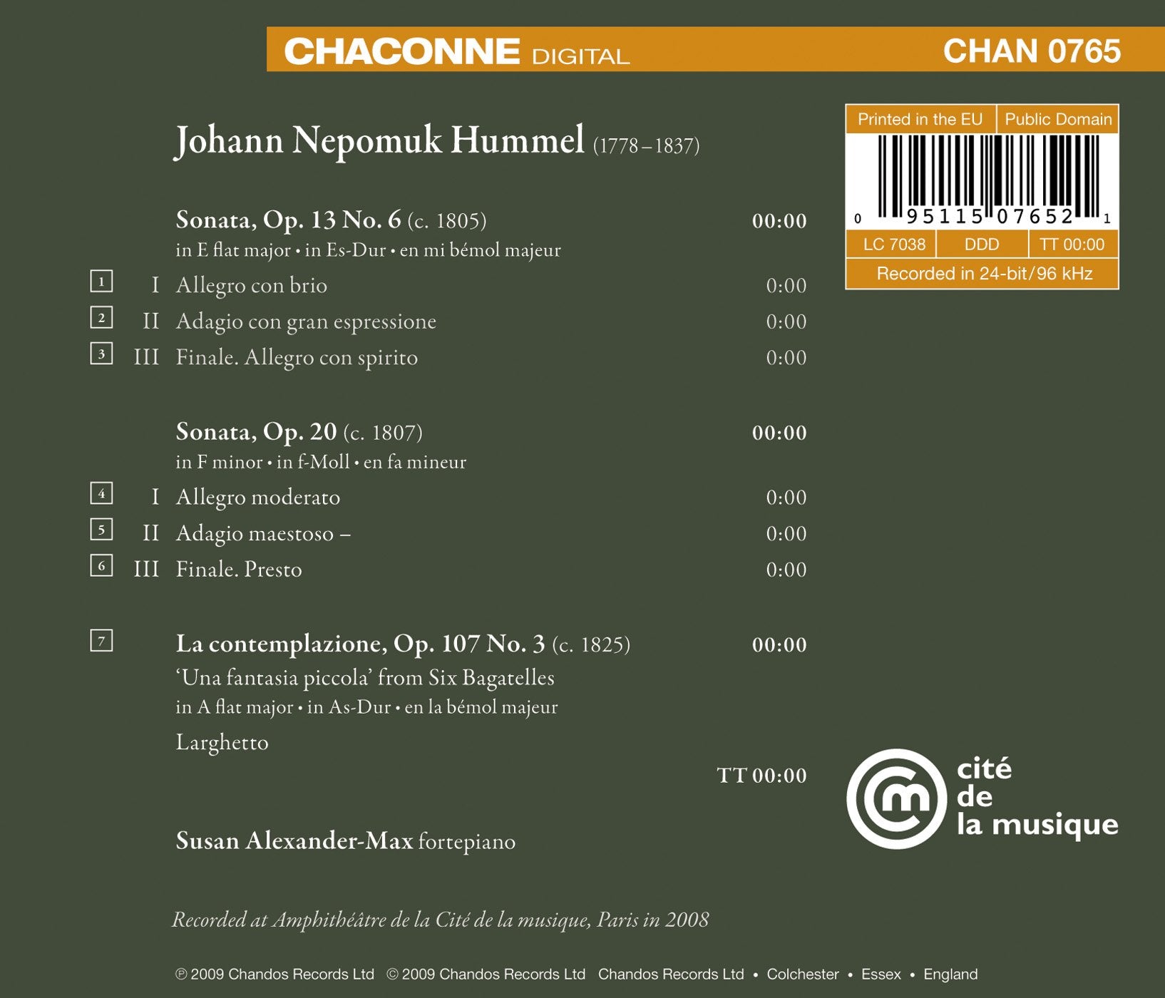 HUMMEL Piano Sonatas: No. 2 in E?; No. 3 in f. Bagatelle in A?, “La contemplazione” • Susan Alexander-Max (fp) (period instrument) • CHANDOS 765 (67:11)