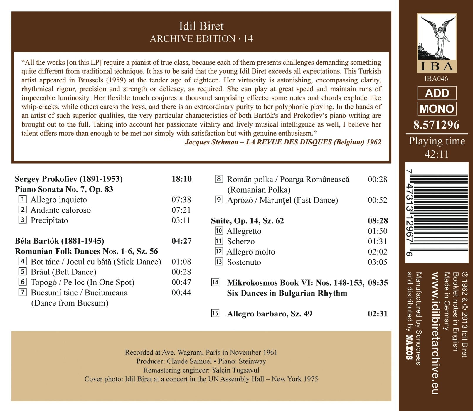 “All the works [on this LP] require a pianist of true class, because each of them presents challenges demanding something quite different from traditional technique. It has to be said that the young Idil Biret exceeds all expectations. This Turkish artist appeared in Brussels (1959) at the tender age of eighteen. Her virtuosity is astonishing, encompassing clarity, rhythmical rigour, precision and strength or delicacy, as required. She can play at great speed and maintain runs of impeccable luminosity. Her flexible touch conjures a thousand surprising effects; some notes and chords explode like whip-cracks, while others caress the keys, and there is an extraordinary purity to her polyphonic playing. In the hands of an artist of such superior qualities, the very particular characteristics of both Bartók's and Prokofiev’s piano writing are brought out to the full. Taking into account her passionate vitality and lively musical intelligence as well, I believe her talent offers more than enough to be met not simply with satisfaction but with genuine enthusiasm.”