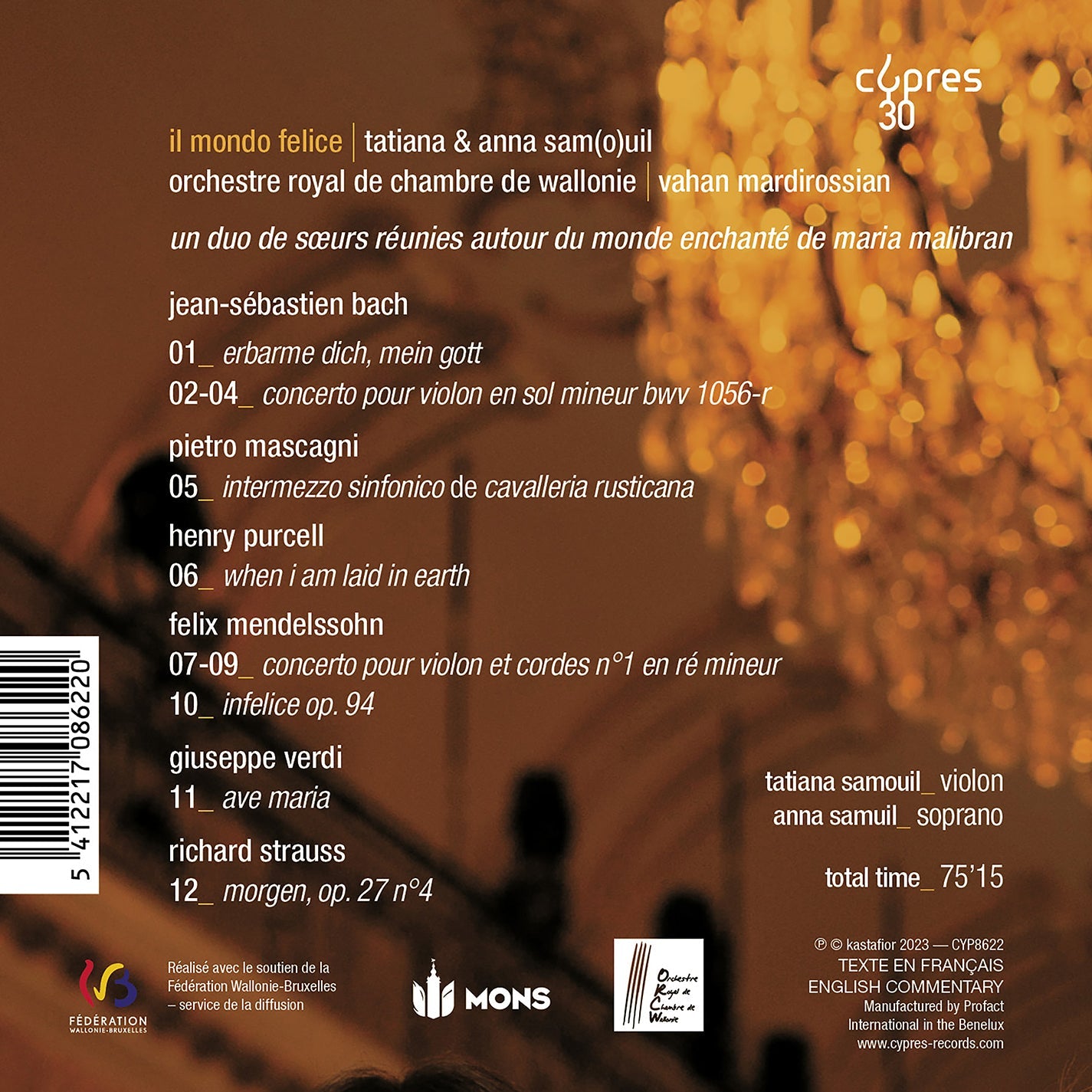 This recording brings to its conclusion the 30th anniversary season of the Cypres label. In an allusion to Confidentes, the first release in this collection, featuring a duet of talented sisters - Marie and Sophie Hallynck - who have had a long history with our label, there is also a sisterly reference here with Tatiana and Anna Sam(o)uil who realise their dream of recording together. They invite us into their world of enchantment, Il Mondo Felice, with a programme that brings together voice, violin and chamber orchestra around the exceptional artiste Maria Malibran.