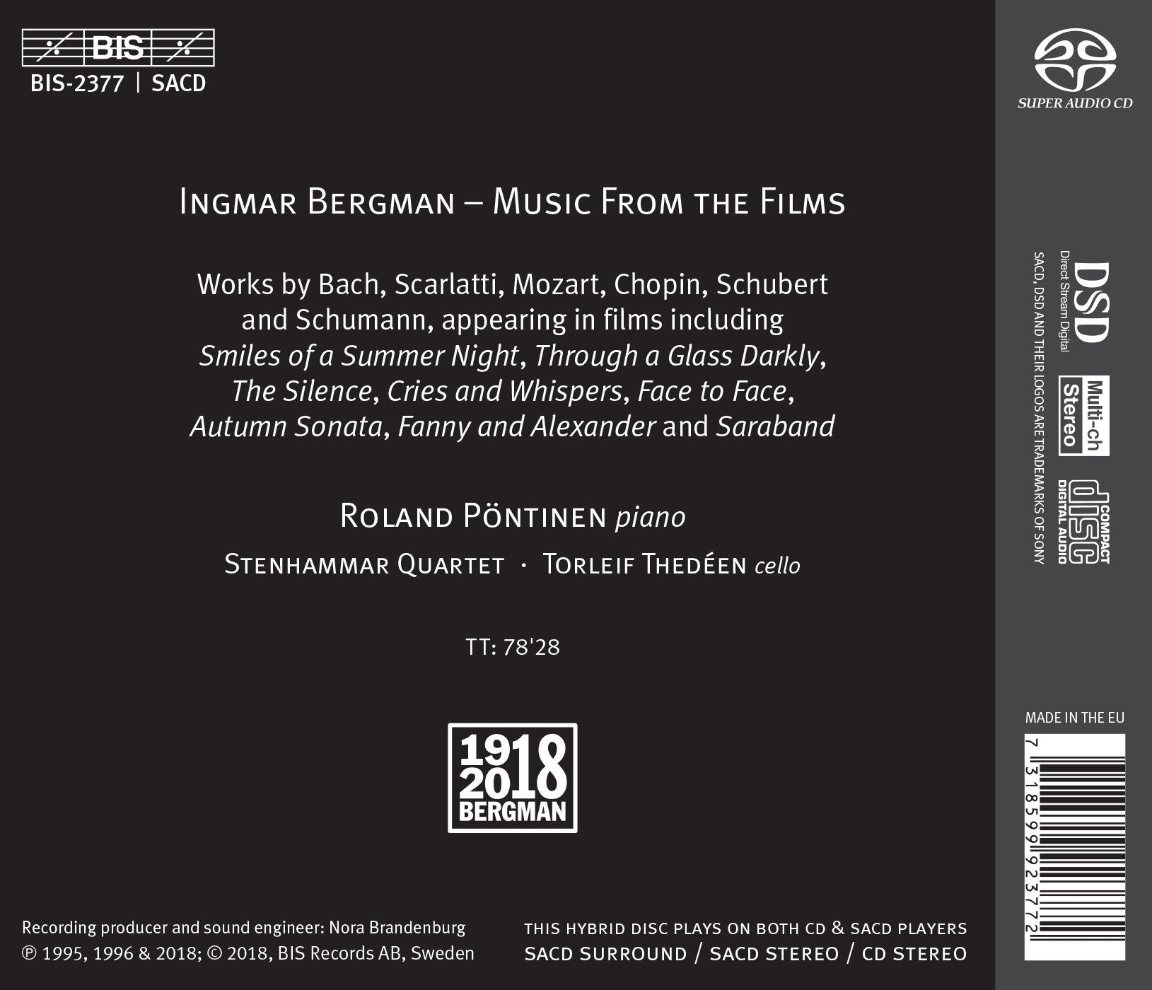 Ingmar Bergman (1918- 2007) made fifty films, directed more than 150 theatre productions and wrote several books, but the recurrent thread running through his life was music. He often said that if he hadn't become a director he would have wished to become a conductor, and went so far as to claim that ‘film and music are almost the same thing. They are means of expression and communication that go beyond human wisdom and that touch a person’s emotional centre.’ Bergman’s interest in classical music became evident early on in his career. Music in Darkness (1948) is about a pianist who loses his sight in a shooting accident. To Joy (1950) features a violinist who dreams of a solo career and Summer Interlude (1951) takes place at the Royal Swedish Opera. He admired all who could perform music, reserving his greatest love for pianists, and concert pianists are portrayed in Hour of the Wolf, Face to Face and Autumn Sonata. One of Bergman’s favourite Swedish pianists was Roland Pöntinen, who here performs a number of pieces featured in Bergman’s films, by composers including Mozart, Chopin and Schumann. Pöntinen is joined by the Stenhammar Quartet in the second movement of Schumann’s piano quintet, used by Bergman to great effect in the award-winning Fanny and Alexander. Another of the director’s favourite performers, the cellist Torleif Thedéen, also contributes to the project, with the sarabandes from three of Bach’s suites for solo cello.