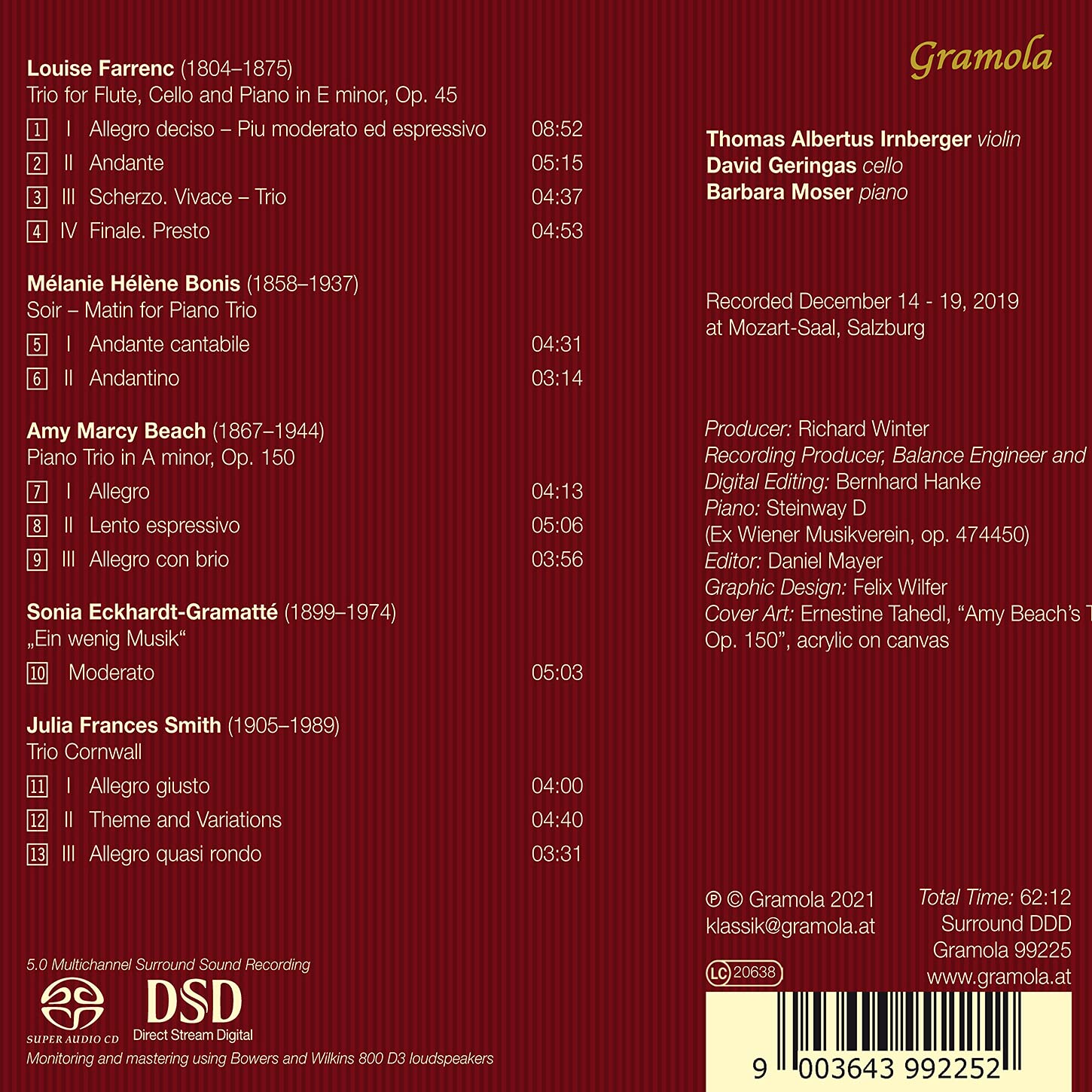 The violinist Thomas Albertus Irnberger, the cellist David Geringas and the pianist Barbara Moser play piano trios by female composers of the 19th and 20th centuries. Amy Marcy Beach artfully combines French modernity with late romantic and American folklore elements in her trio from 1938, Sonia Eckhardt-Gramatté's work “Ein wenig Musik” (A Piece of Music) impresses with originality, melodious ideas and diverse rhythmic components, Louise Farrenc's trio from 1857 shows that she was a contemporary of early Romanticism, but also dealt with Ancient music, Mélanie Hélène Bonis’ pieces for piano trio “Soir” and “Matin” were created in 1907 and reflect the different moods of a day, while Julia Frances Smith's Cornwall Trio from 1966 expresses the funny, playful energy of the gifted composer that she was.