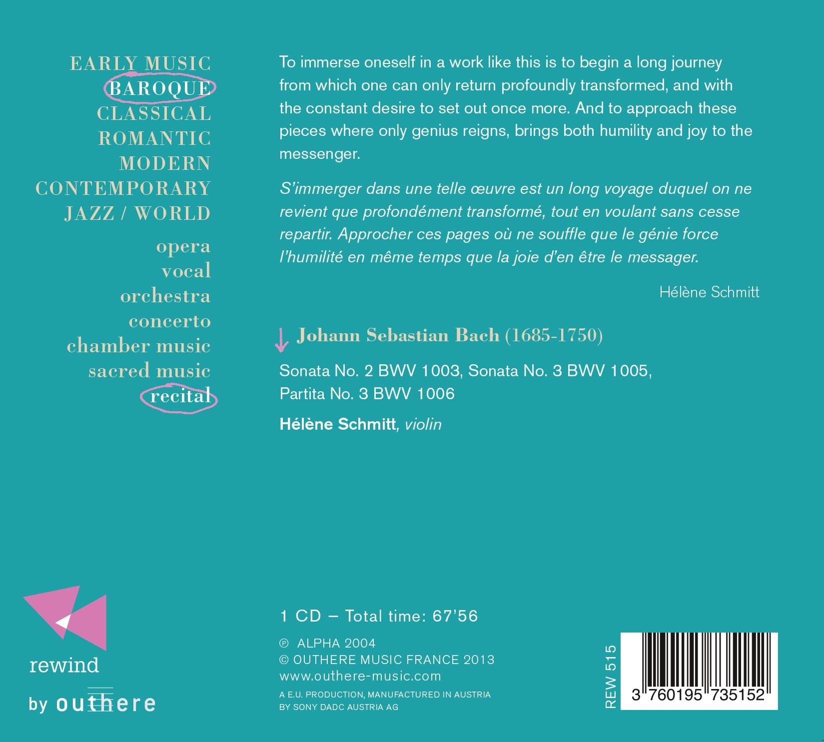 Bach composed these and other famous works, including the Brandenburg Concerti and the Cello Suites, during his Capellmeister years in Anhalt-Cöthen, Saxony, 1717-23. Violinist Hélène Schmitt, a fixture on European stages, mostly plays the solo violin repertoire of the 17th - early 19th century. She shows a special interest in and affinity for Italian and German music and culture. The international critics always receive her concerts and recordings enthusiastically.