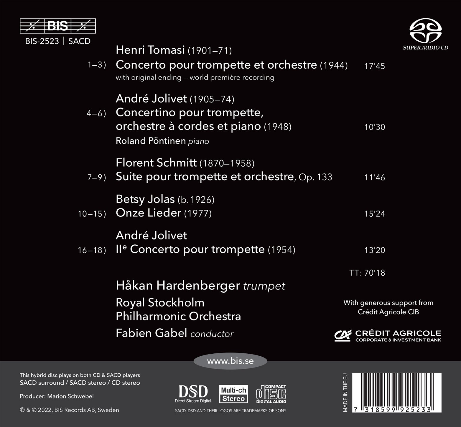 During the second half of the 19th century, a French school of trumpet playing was established, with French musicians and composers at the forefront of the instrument’s musical and technical development. As a result, it was entrusted with a more prominent role within the orchestra and soon also as a solo instrument. On the present disc, Håkan Hardenberger – who like so many other leading trumpet players studied in Paris – presents some of the fruits of this development: five important French works composed between 1944 and 1977. With the support of the Royal Stockholm Philharmonic Orchestra and conductor Fabien Gabel – who incidentally began his career as a trumpet player – he opens the disc with Henri Tomasi’s Trumpet Concerto. Often performed and recorded, it here appears on album for the first time with its original, longer ending, reconstructed from a newly discovered manuscript. Another rarity is the version for trumpet and orchestra of Florent Schmitt’s Suite, a work which is more commonly heard with piano accompaniment. Rather more frequent in concert are André Jolivet’s Concerto and the Concertino in which Hardenberger is joined by his regular chamber music partner Roland Pöntinen as co-soloist. The most recent work on the disc is Onze Lieder by Betsy Jolas, a work which has a special resonance for both soloist and conductor as it was written for their trumpet teacher Pierre Thibaud.