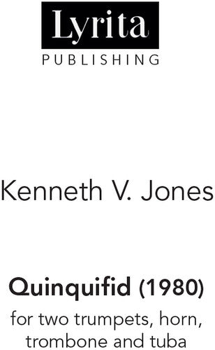Among his many compositions, Kenneth V. Jones wrote a concerto for string orchestra (1956), a concerto for oboe and strings (1963), The Pollock, an orchestral prelude (1963), O Light Invisible, a cantata for soprano, mixed chorus and orchestra (1963), a sonata for solo violin (1967), Dialysis, for violin and harpsichord (1973), Quaquaverse, for saxophone quartet (1979), Paean for organ (1983), three Sinfonias for orchestra, as well as piano works, song cycles, film, play and television scores and church music, including hymns and anthems. Quinquifid for Brass Quintet (1980) was written for Equale Brass, who premiered the piece in the Purcell Room on 6 December 1980. Quinquifid was first broadcast by the BBC on Radio 3 on 30 December 1981. The structure of this work is built on a notion of five sections, each linked without a break by cadenzas for each of the solo instruments. The opening movement begins with an Andante introduction flecked by flutter-tongued trumpet and moves into a more urgent Allegro section that exploits the lyrical qualities of the tuba to expressive effect. Gradually the music intensifies, building to a powerful climax, before falling away abruptly, paving the way for the next section, a brief duet for the two trumpets, marked 'Shadow Play' in the score. Light and lively, the finale offers flowing interplay between the instruments and brings the score to a confident conclusion.