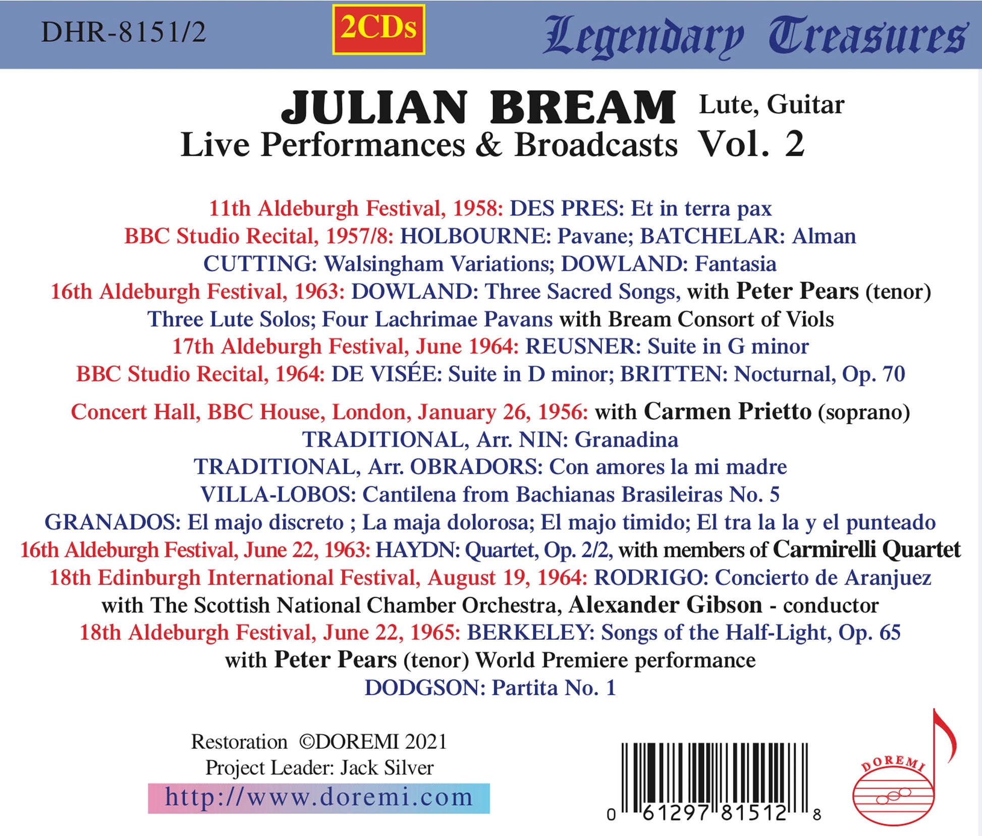 Julian Bream, who passed away in August 2020, is the finest classical guitarist in the second half of the 20th century. Doremi is proud to release this tribute to his wonderful artistry. The program of works for lute and guitar solo and in a variety of ensemble settings, never before released, offers a remarkable panorama of Bream's magnificent playing between 1956 and 1965, including two studio broadcasts. (Doremi)
