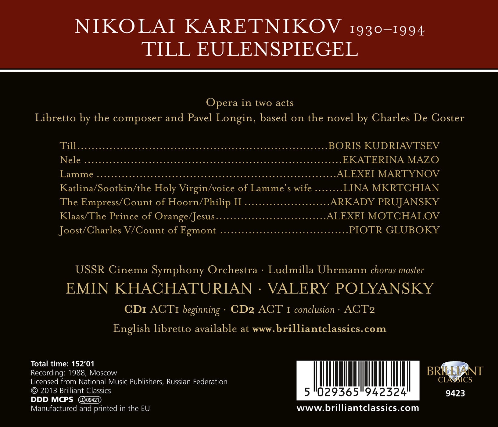 The product of almost 20 years’ work, a true fusion of many types of opera, thanks to the buffa elements of Till’s trickster personality, the drama of Klaas’ death, and the opéra engagé nature that introduces the characters of Charles V, Philip II and the Count of Egmont. This is the only recording of this significant work. In the title role is Boris Koudriavstev, and Ékatérina Mazo plays Till’s fiancée alongside a native cast that contributes to this “fascinating, important and inspiring issue” (Gramophone).