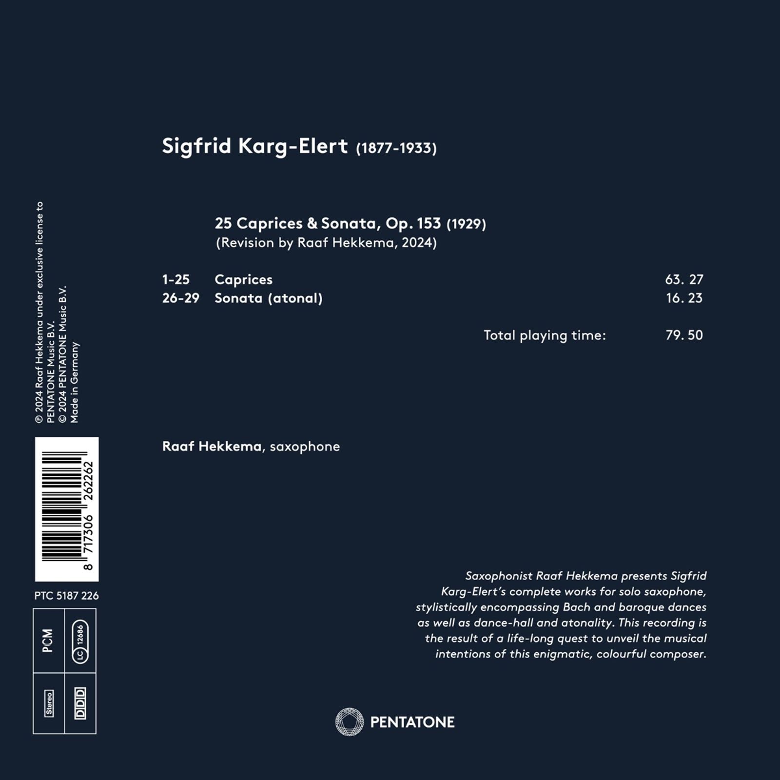 Saxophonist Raaf Hekkema presents Sigfrid Karg-Elert's complete works for solo saxophone, stylistically encompassing Bach and baroque dances as well as dance-hall and atonality. This recording is the result of a life-long quest to unveil the musical intentions of this enigmatic, colourful composer. It's hard to think of a better ambassador for this vibrant repertoire than Raaf Hekkema, one of today's most-acclaimed saxophonists. Raaf Hekkema is an adventurous Dutch saxophonist. Performing mainly his own arrangements, he gives approximately 100 concerts per year the world over. This is his first solo project on PENTATONE, after having released Hidden Gems (2018), Dido & Aeneazz (2019), Bach's Musical Offerings (2020) and An American Rhapsody (2023) as member of the Calefax Reed Quintet.