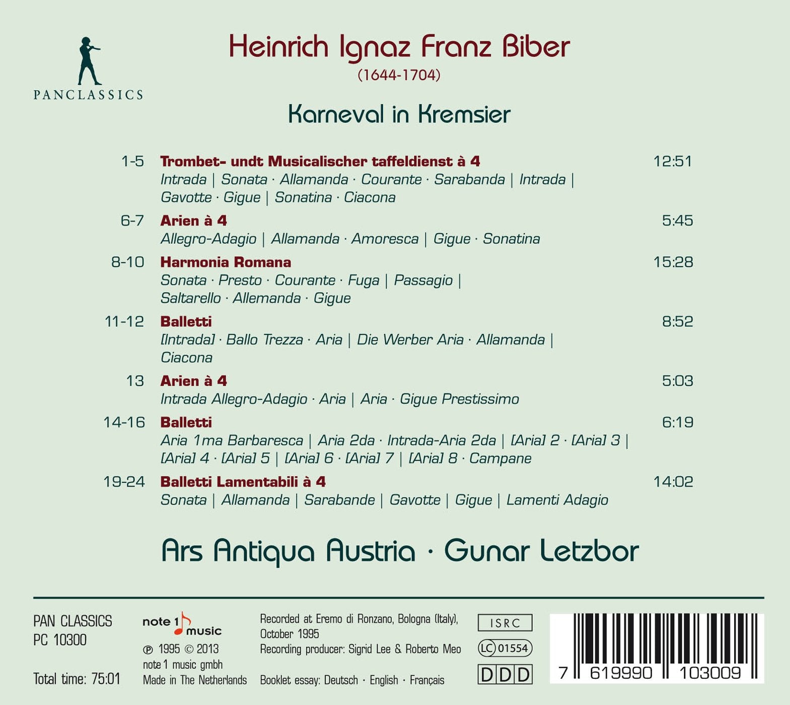 The violinist Gunar Letzbor is an established specialist in performing Austrian baroque music; in particular, he has especially intensively grappled with works of Biber, Muffat and Schmelzer, to name three examples. In so doing, he is constantly searching for the specifically Austrian baroque string sound. With the present recording of dance movements by Heinrich Ignaz Franz Biber, Letzbor and his Ensemble Ars Antiqua Austria portray a fictitious carnival at the court of the music-loving prince-bishop in Kremsier where a very independent, forward-looking orchestral sound was developing. Through the mixture of numerous instrumental timbres, a sonic variety was attained that already points ahead to the 'modern' orchestral instrumentation of Viennese classicism. We can hear the special characteristics of Bohemian-Moravian folk music in many of the compositions from the Kremsier music collection recorded here. The spectrum of the selected dance movements ranges from gallant and graceful to rustic and exuberant. Letzbor and his Ensemble play them with charm and élan - occasionally interrupted by the night watchman, who makes it known what time it is. Before the last movement is over, the tower clock suddenly strikes twelve times, bringing the happy hustle and bustle to an abrupt end; six Balletti lamentabili conclude this recording with the appropriate solemnity.