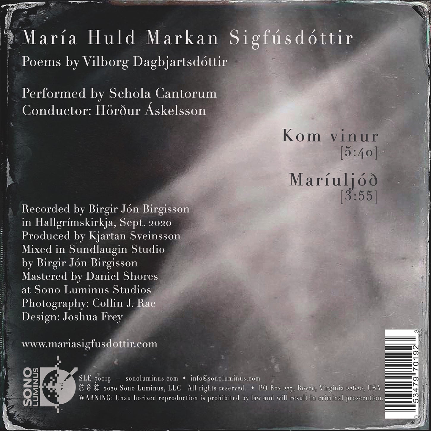 I feel impelled at the outset to point out that this is an EP containing less than 10 minutes of music, but what beautiful music it is! Icelandic composer Maria Huld Markan Sigfúsdóttir (b. 1980) writes of the two compositions on this recording that they are “composed to poems by the Icelandic poet Vilborg Dagbjartsdóttir. The poems are the absolute core of the pieces; when composing them, I felt like excavating music from the text, unravelling hidden sounds from the words. Kom vinur has a somber undertone, a sense of loneliness and longing for sharing light and thoughts with a friend in the dark winter night. In Maríuljóô the tender view is through the eyes of a child observing subtle changes in nature and the seasons as well as asking the mother questions about the image of the Holy Mother.”