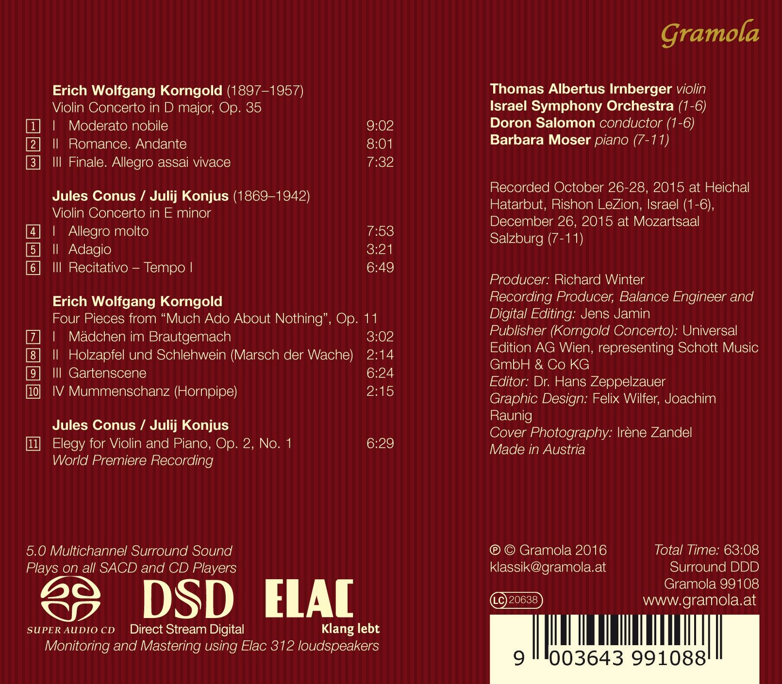 The music of Austrian composer Erich Wolfgang Korngold is found in several Hollywood soundtracks. His Violin Concerto D major Op. 35 includes several themes and melodies from his film scores. While the only work from Julius Conus that is still frequently performed and recorded is his Violin Concerto in E minor, a notable inclusion on this release is his Elegy Op. 2 No. 1 for violin and piano, which is a world premiere recording. Violinist Thomas Albertus Irnberger has won many awards and performed at festivals all over the world. He frequently performs with the Israel Chamber Orchestra, and the orchestra “Spirit of Europe.” Here he is joined by the Israel Symphony Orchestra, which was the first orchestra in Israel to perform standard works by Richard Strauss, Alexander Zemlinsky, and others. +