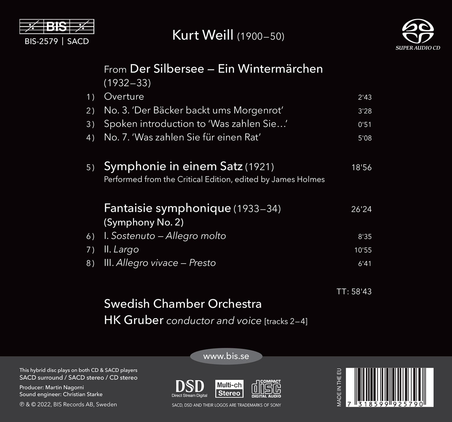 Although Kurt Weill’s principal legacy lies in music theatre works of both popular appeal and intellectual weight, he was equally at home in purely orchestral works as evidenced by his two symphonies. Written just over a decade apart, they reveal his chameleon-like ability to work with any range of style and form. The Symphonie in einem Satz (Symphony in one movement), completed when he was barely 21, adopts an expressionist idiom that shows intricate writing, dense counterpoint and quick shifts reminiscent of Schoenberg's First Chamber Symphony. Completed in France in 1934 after Weill had to flee Nazi Germany, the Fantaisie symphonique is filled with allusions to the 'sung ballet' The Seven Deadly Sins, composed at the same time. Opening the programme is a selection from the ‘play with music’ Der Silbersee (The Silver Lake), a commentary on commercial greed. As in The Threepenny Opera, the vocal parts were composed for singing actors rather than opera singers. Steeped in the world of Weill, conductor, composer and chansonnier HK Gruber performs the songs himself in his own inimitable way, giving an unusual authenticity to the interpretations.