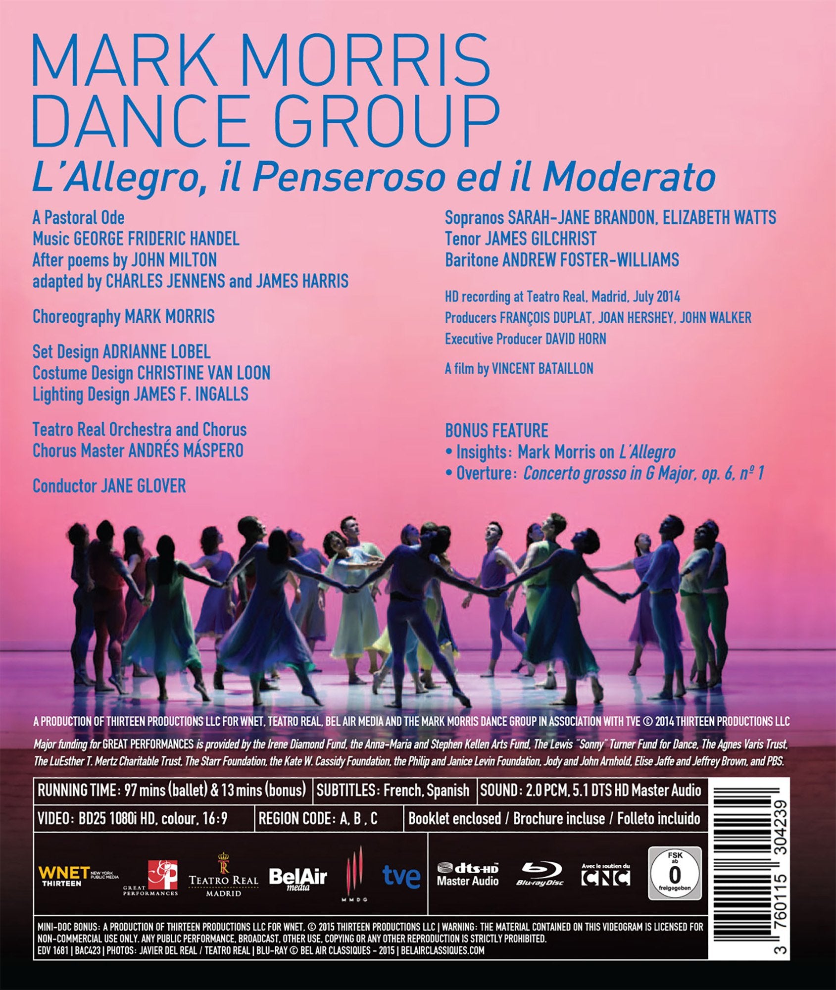 Choreographer Mark Morris garnered international fame for "L'Allegro, il Penseroso ed il Moderato", considered a landmark achievement, and set to Handel's Baroque masterpiece, in which a colorful array of dancers embody the ecstasy of art that transforms. "L'Allegro" was Mark Morris's premiere work as Director of Dance at the Théâtre Royal de la Monnaie in Brussels, Belgium in 1988, and in the intervening years, has been performed to critical and audience acclaim all over the world. Winner of numerous awards including a Laurence Olivier Award, "L'Allegro" uses Milton's text and features sets inspired by William Blake's later watercolors. Founded in NYC in 1980, the Mark Morris Dance Group (MMDG) is considered one of the preeminent modern dance companies, its members praised repeatedly for their technique and musicality. Live music and community engagement are vital components of the Dance Group, which has toured with its own musicians, the MMDG Music Ensemble, since 1996. Through Access/MMDG programming, the Dance Group provides educational opportunities in dance and music to people of all ages and abilities while on tour internationally and at home at the Mark Morris Dance Center in Brooklyn, NY. The performance was filmed July 2014 at the Teatro Real in Madrid, Spain.