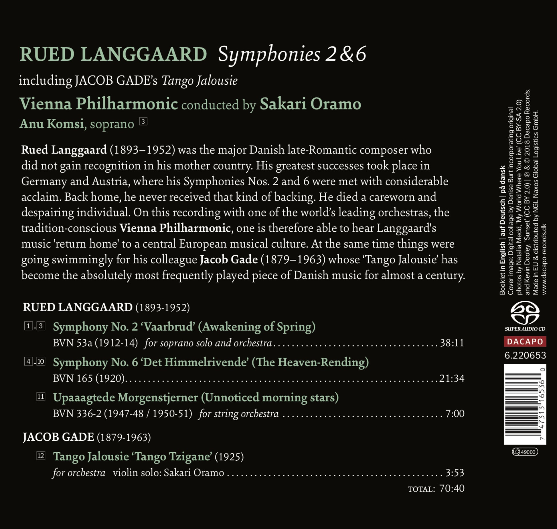Rued Langgaard (1893–1952) was a major Danish late-Romantic composer who did not gain recognition in his mother country. His greatest successes took place in Germany and Austria, where his Symphonies Nos. 2 and 6 were met with considerable acclaim. Back home, he never received that kind of backing and praise. He died a careworn and despairing individual. On this recording with one of the world’s leading orchestras, the tradition-conscious Vienna Philharmonic, one is therefore able to hear Langgaard's music 'return home' to a central European musical culture. At the same time things were going swimmingly for his colleague Jacob Gade (1879–1963) whose ‘Tango Jalousie’ has become the absolutely most frequently played piece of Danish music for almost a century. The two pieces are juxtaposed here to create a delightful programme.