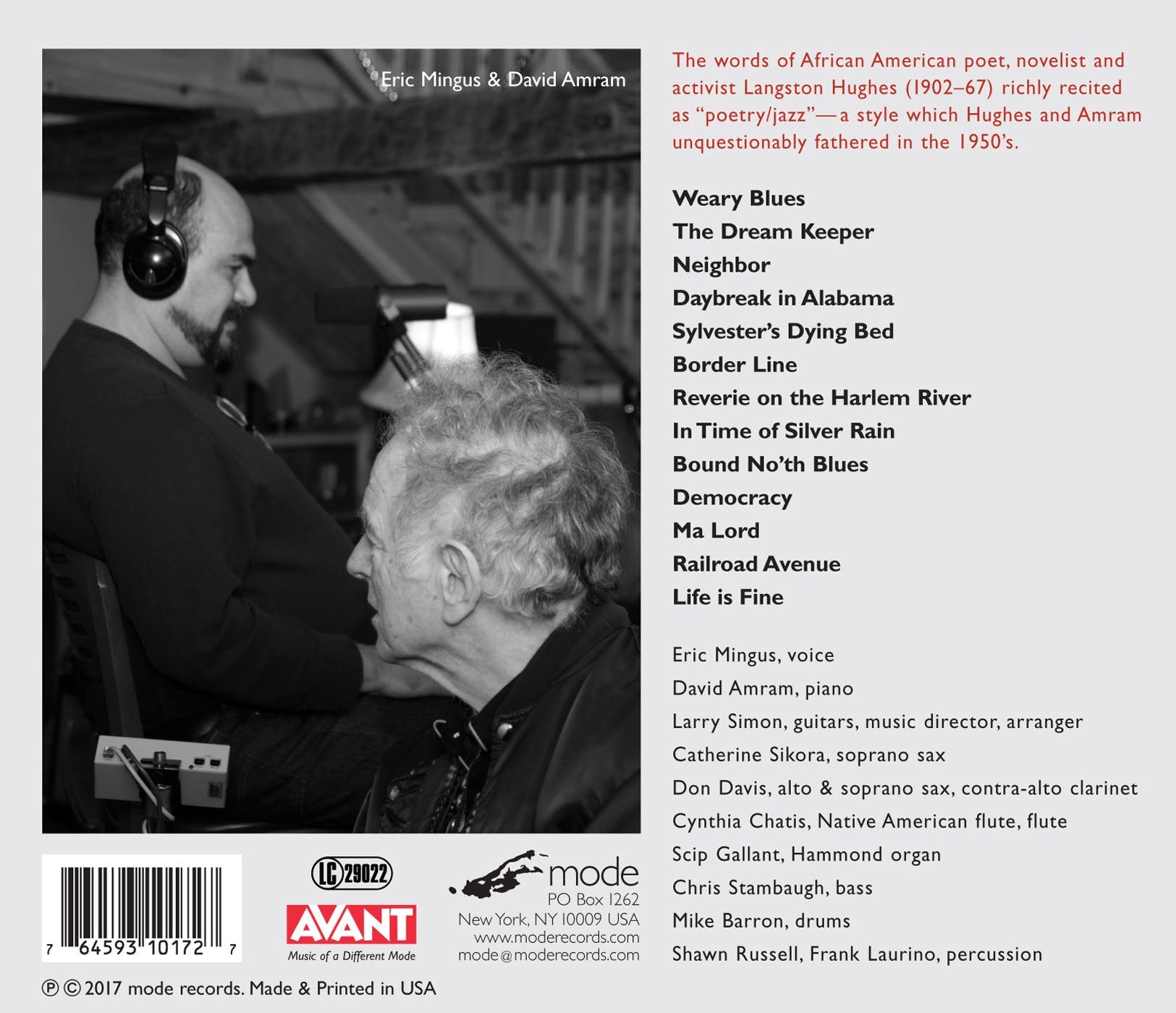 Langston Hughes (1902–67) was an American poet, novelist, social activist and playwright whose work showcased the dignity and beauty in ordinary black life. His African-American themes made him a primary contributor to the Harlem Renaissance of the 1920s. The hours he spent in Harlem clubs affected his work, making him one of the innovators of “Jazz Poetry.” Hughes’ poetry is still powerful and contemporary today. The Langston Hughes Project came from jazz guitarist Larry Simon, who is the founder of JazzMouth, unique festival in Portsmouth, New Hampshire that combines jazz and spontaneous music with readings by some of the finest poets. Hughes’ texts are brought to life by the rich, soulful delivery of Eric Mingus, son of Charles Mingus. For some years he worked as a session musician and backing singer, playing on dates with artists such as Carla Bley, Bobby McFerrin and Karen Mantler. He has also performed with the Mingus Big Band, Elliott Sharp’s Terraplane, Todd Rundgren, Elvis Costello, Nick Cave, Catherine Sikora and Levon Helm, and a featured performer in many of Hal Willner’s projects. Simon also brought David Amram — composer, conductor, multi-instrumentalist, and author — to the project. As a classical composer and performer, his integration of jazz, folk and world music led him to work with Dizzy Gillespie, Lionel Hampton, Willie Nelson, Charles Mingus, Levon Helm and Betty Carter. Amram has composed more than 100 orchestral and chamber music works, and written many scores for Broadway theater and film, including the classic scores for the films Splendor in The Grass and The Manchurian Candidate. Amram collaborated with Hughes on the cantata "Let us Remember." Importantly, in the 1950s Amram collaborated in clubs with Langston Hughes and Jack Kerouac on the spontaneous creation of words and music which came to be known as “jazz/poetry.” And jazz/poetry is what “Langston Hughes: The Dream Keeper” is. Half of the poems find Mingus with Amram on piano, as a duo. The instrumentally varied balance of the album are Mingus duos with electric guitar or Hammond organ; with woodwinds and percussion or larger ensembles.