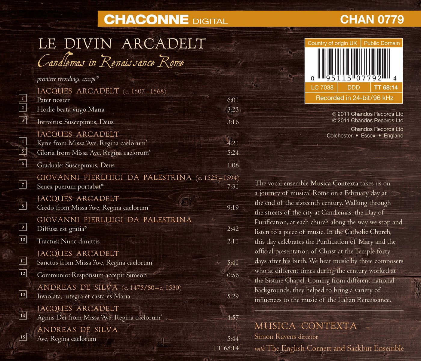 Not a huge amount is known about Jacques Arcadelt, or at least, the booklet notes don’t go into his life in great detail. The central work which threads this programme together is his Missa ‘Ave, Regina caelorum’ which used Andreas de Silva’s motet Ave, Regina caelorum as its basis. The whole sense of historical flow, from de Silva though Arcadelt to Palestrina, who arrived in Rome in the year Arcadelt left to go back to France, is as strong as the sense of flow through an imaginary Candlemas day of music, and the music has a seamless feel of unity and connection, one piece to the other. The warm accompaniments of The English Cornett and Sackbut Ensemble enhance a few of the works, with de Silva’s remarkably spare and modern sounding Inviolata, integra et casta es Maria providing something of a highlight in this regard, a solo female voice rising from among the rounded brass sounds as the contrapuntal lines intertwine through slow moving, sometimes somewhat enigmatic sounding harmonies. The choral richness of the Missa is cleverly dosed throughout the disc, the Agnus Dei delivering a climax which makes the entire journey all the more worthwhile.