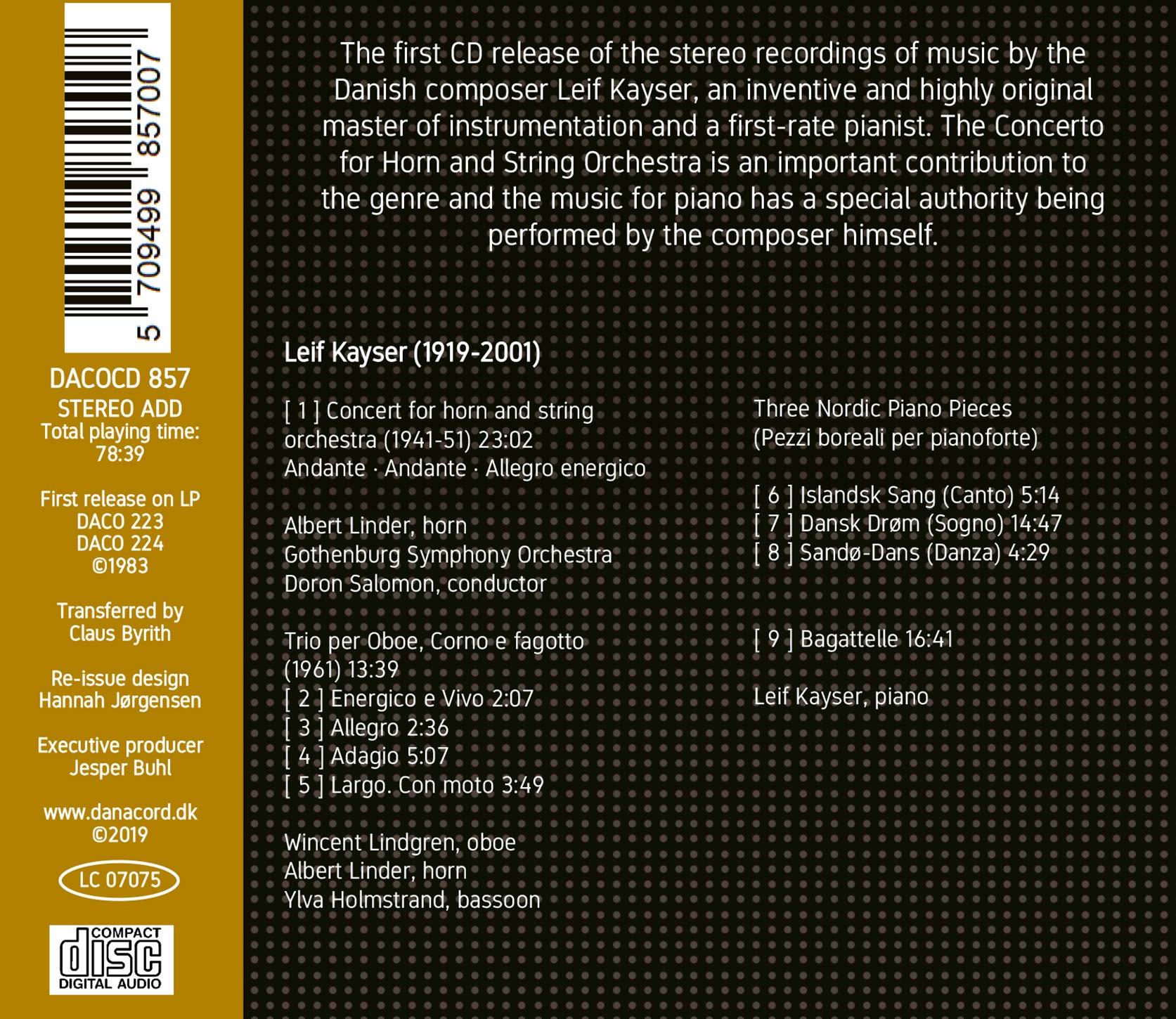 Danish composer Leif Kayser could have been 100 years here in 2019 and we are releasing for the first time on modern technology two rare LP issues, one with the Hindemith-inspired Horn Concerto and the Trio which has strong resemblance to the French school. Most important is a series of piano music performed by the virtuoso composer himself. This album is done using the original master tapes and is probably the most significant example of the art of Leif Kayser, a composer strongly in the line of Nielsen. Leif Kayser was an organist and composer. He studied at the Royal Academy of Music in Copenhagen with Poul Schierbeck and Hilding Rosenberg and with Nadia Boulanger in Paris. He later returned to the Royal Academy of Music in Copenhagen as a teacher. He had extensive concert activities as an organ and piano soloist. His works include orchestral music (four symphonies etc.), compositions and transcriptions for concert band, film music, piano, organ, and chamber works; choral music (five masses etc.) and songs, including children's songs.
