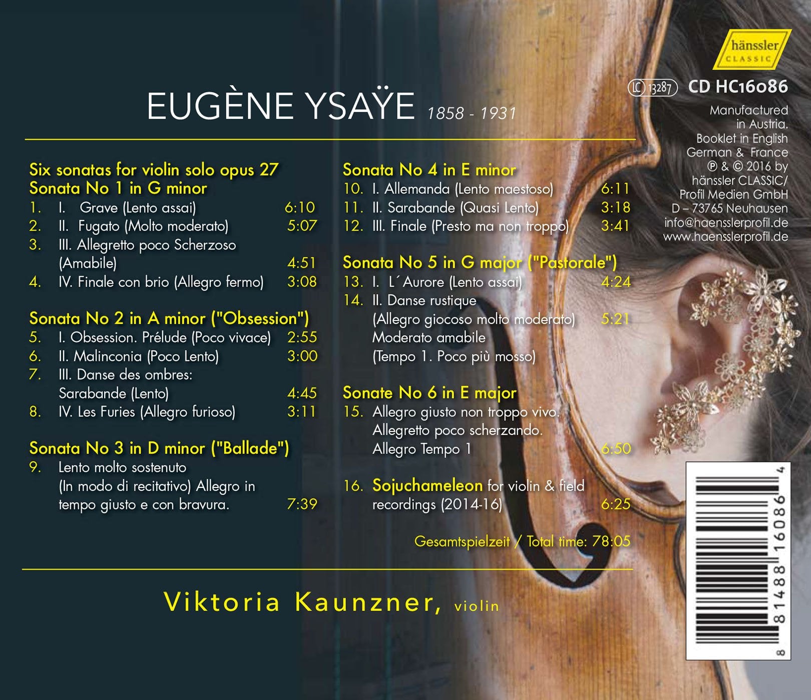 This new release showcases Eugene Ysaye’s Six soantes pour violon seul, op. 27. An exuberant product of the Roaring Twenties, they are played on the 1735 Ex-David/Midori Guarneri del Gesu violin, a superb instrument that I wish I owned. The sonatas are joined, in a time-travelling leap forward to the hypermodern era, by V. E. Kauzner’s own composition, the Sojuchameleon for violin and field recordings. It was recorded in the zen-like atmosphere of a monastery, and complements of the release’s title, which campaigns for the introduction of a noise tax in urban areas. Kauzner first heard the Sonata No. 3 “Ballade” from the Six sonates op. 27 in 1999, and was enchanted by its sonorous beauty. To him, it sounded like the wind. After years of performing all six sonatas, he decided to record them. However, he came up with very little information about Ysaye’s life. Only one book was ever written about him, but Carl Flesch described him as the “violin incubator of Europe,” and “the most outstanding and individual violinist I have ever heard in my life.”