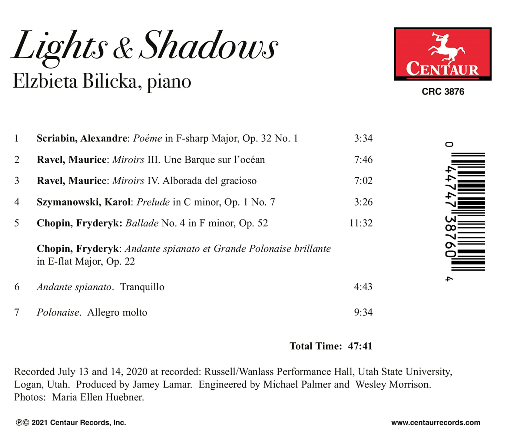 U.S.-based Polish pianist Elzbieta Bilicka has been praised for "organic combination of thought and emotion." This can be keenly felt in this evocative program "Lights & Shadows." Elżbieta Bilicka was born in Słupsk (Poland). In 2011 she finished the music school in her hometown and passed her leaving examinations at the III Navy High School in Gdynia. In 2016 she got the Masters of Arts degree at the Feliks Nowowiejski Academy of Music in Bydgoszcz where she studied with Agata Nowakowska-Gumiela, Alberto Nosè and Katarzyna Popowa-Zydroń. From 2016 to 2018 she was a member of the class of Nelson Goerner at the Haute Ecole de Musique de Geneve in Switzerland. Elżbieta has taken part in various piano competitions winning prizes and distinctions. The latest and most important of them are: the honorable mention, laureate title and special prizes for the best rendition of a W.A. Mozart concerto and I.J. Paderewski pieces at the X International Ignacy Jan Paderewski Piano Competition in Bydgoszcz (2016) and the 3rd prize at the Polish Chopin Piano NIFC Competition in Katowice (2016). In 2018 Elżbieta was awarded The Young Poland Scholarship of the Polish Minister of Culture.