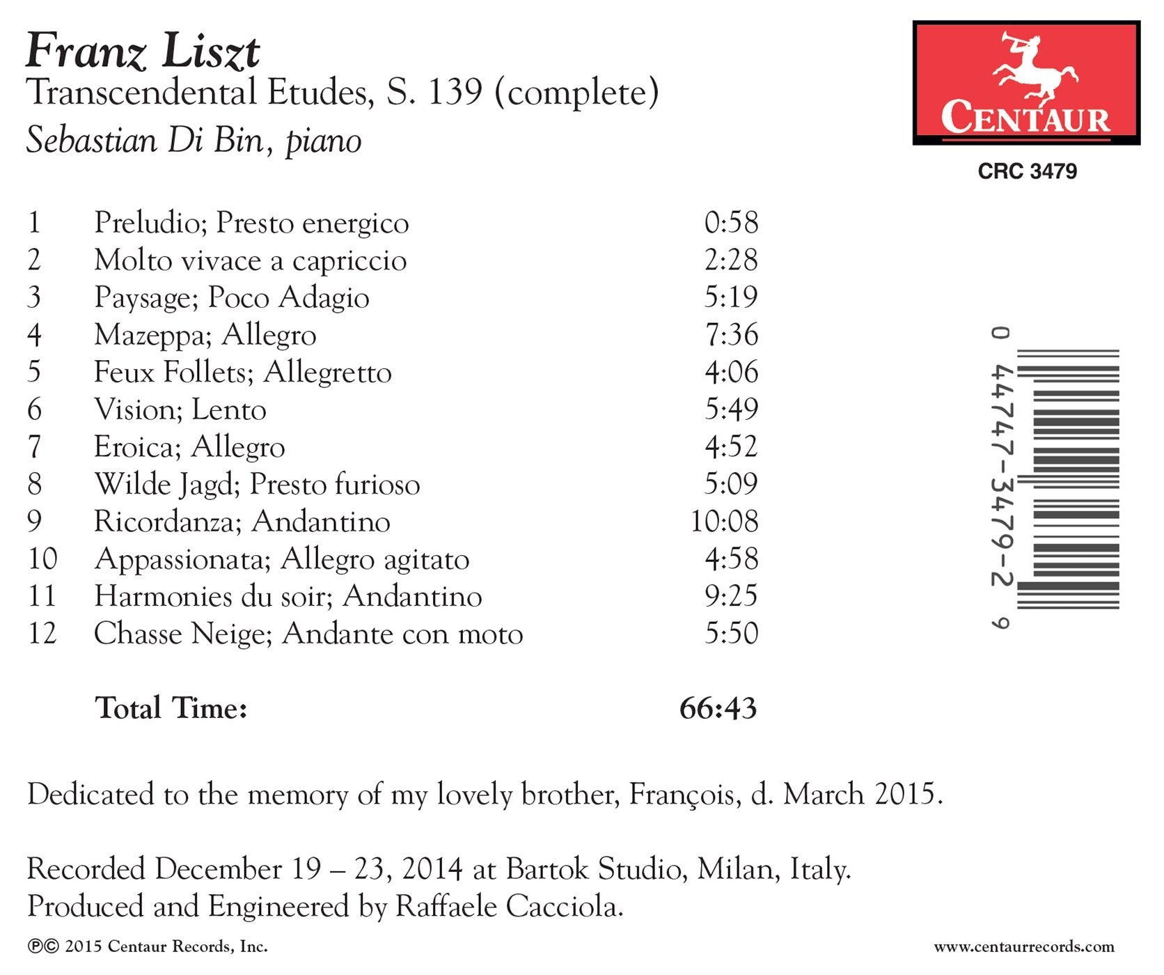 Italian pianist Sebastian Di Bin provides us here with an intriguingly beautiful performance of Franz Liszt’s complete Transcendental Etudes. Sebastian Di Bin has dedicated this album to the memory of his brother, Francois, who passed away in March 2015. The composition of Liszt’s twelve Transcendental Etudes began when the 15-year-old composer composed a set of much less difficult exercises titled the Etude en douze exercices. These works were elaborated upon to become his Douze Grandes Etudes in 1837, then finally revised and republished in 1852 as the etudes performed here.