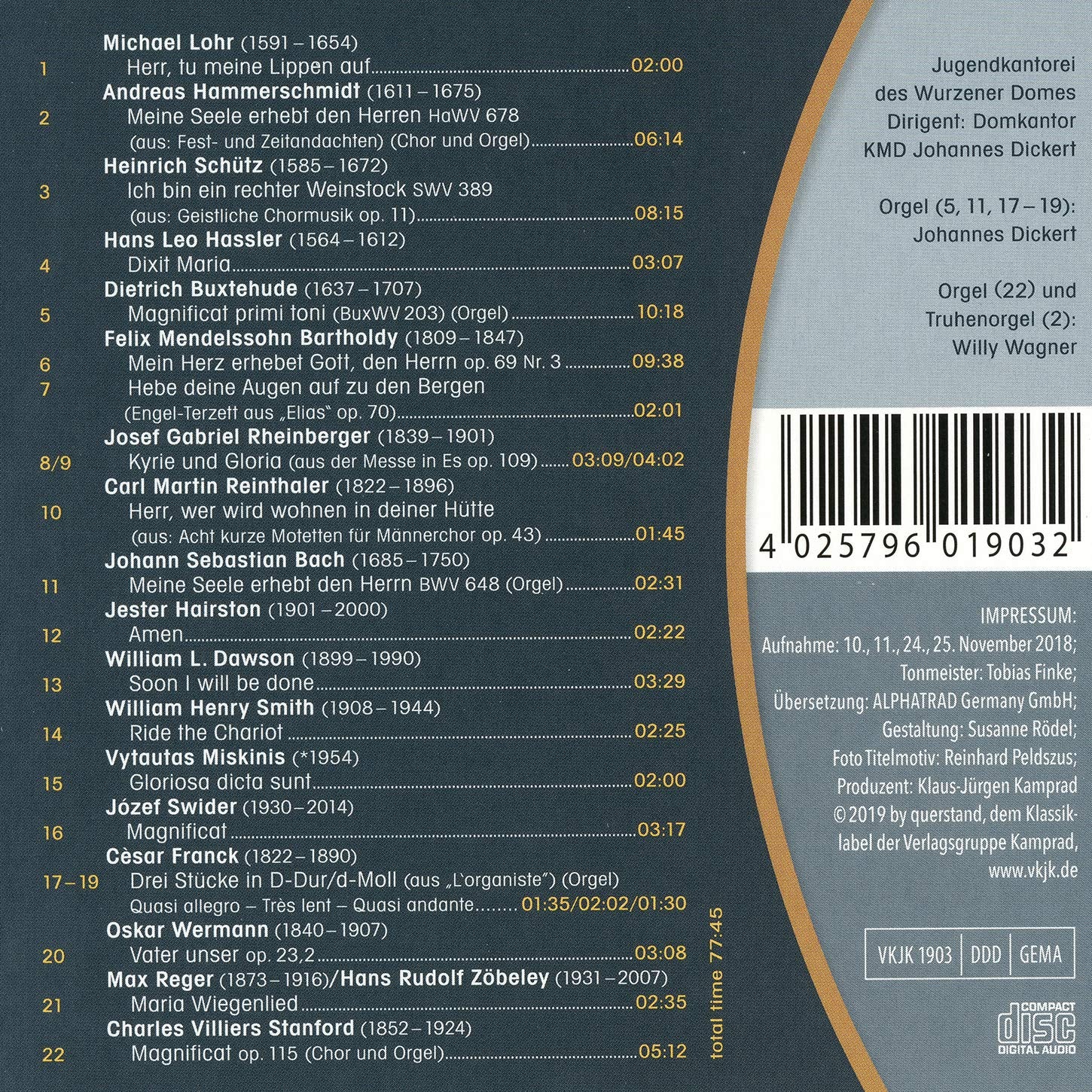 If you have been a choir or choir director at a Marien church for over 30 years, it is difficult for you as an evangelical Christian to evade the subject of Maria. Although the Protestants are assumed to have a rather cool relationship with the mother of Jesus, in such a church one literally stumbles across texts, representations and references to a piety from Mary - a piety that Mary does not necessarily make an advocate for God, but she is a role model for faith Especially when, after a strenuous day of rehearsals in a 12th century cathedral in medieval melodies of young voices, the old words from the New Testament sound: "My soul exalts the Lord and my spirit rejoices in God, my Savior", one thinks As a Lutheran - MAGNIFICAT! Magnificat settings therefore form the framework for the new, fourth album of the youth choir of the cathedral in Wurzen. Of course, one cannot deal with Maria musically without singing about her son Jesus, to tell the whole story, so to speak. So does the youth choir on this release (Hairston - "Amen"). There is also the example speech of the wandering preacher such as "I am a right vine" (Schütz), which encourages clinging to God, the question of right prayer, which Jesus answers with the "Our Father" (Wermann), the longing for God Closeness and presence in "Kyrie and Gloria" by Rheinberger or in Mendelssohn's "I lift my eyes to the mountains". The Kingdom of God plays a central role in Jesus' sermon, which can already be felt here in this world and endures transience. Jesus himself lived in this hope of inseparable communion with God and the spirituals also sing about it in the images of their time.