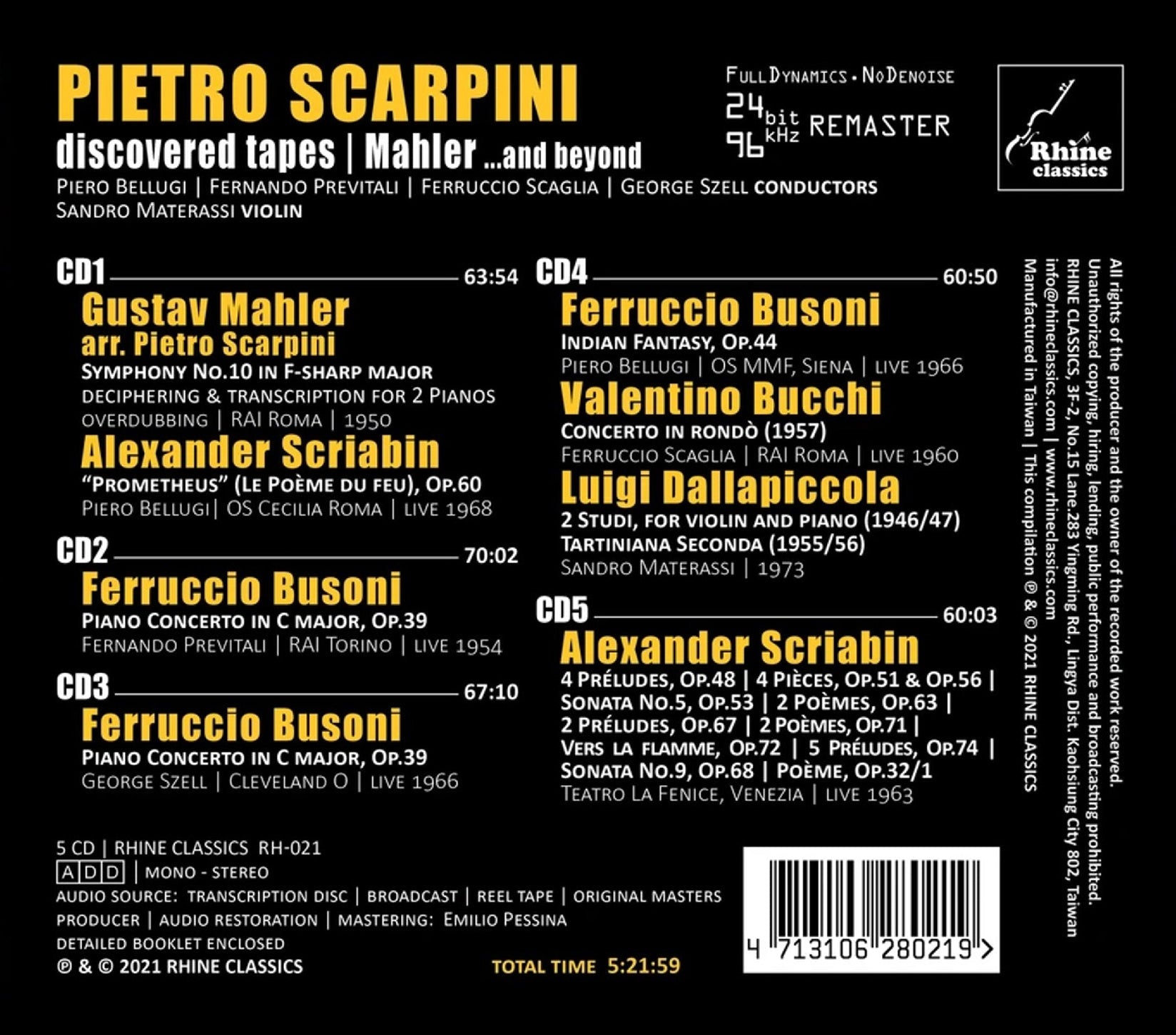 Pietro Scarpini was that rare combination: a highly intellectual pianist with a virtuoso technique. He was a dignified and solitary person with a serious approach to music, single-mindedly following the course of his artistic convictions without compromise. Musicweb writes: ‘The sixth and final volume of a wonderful recorded legacy. As with the previous volumes, the remasterings are superb in every respect.” (Rhine Classics)