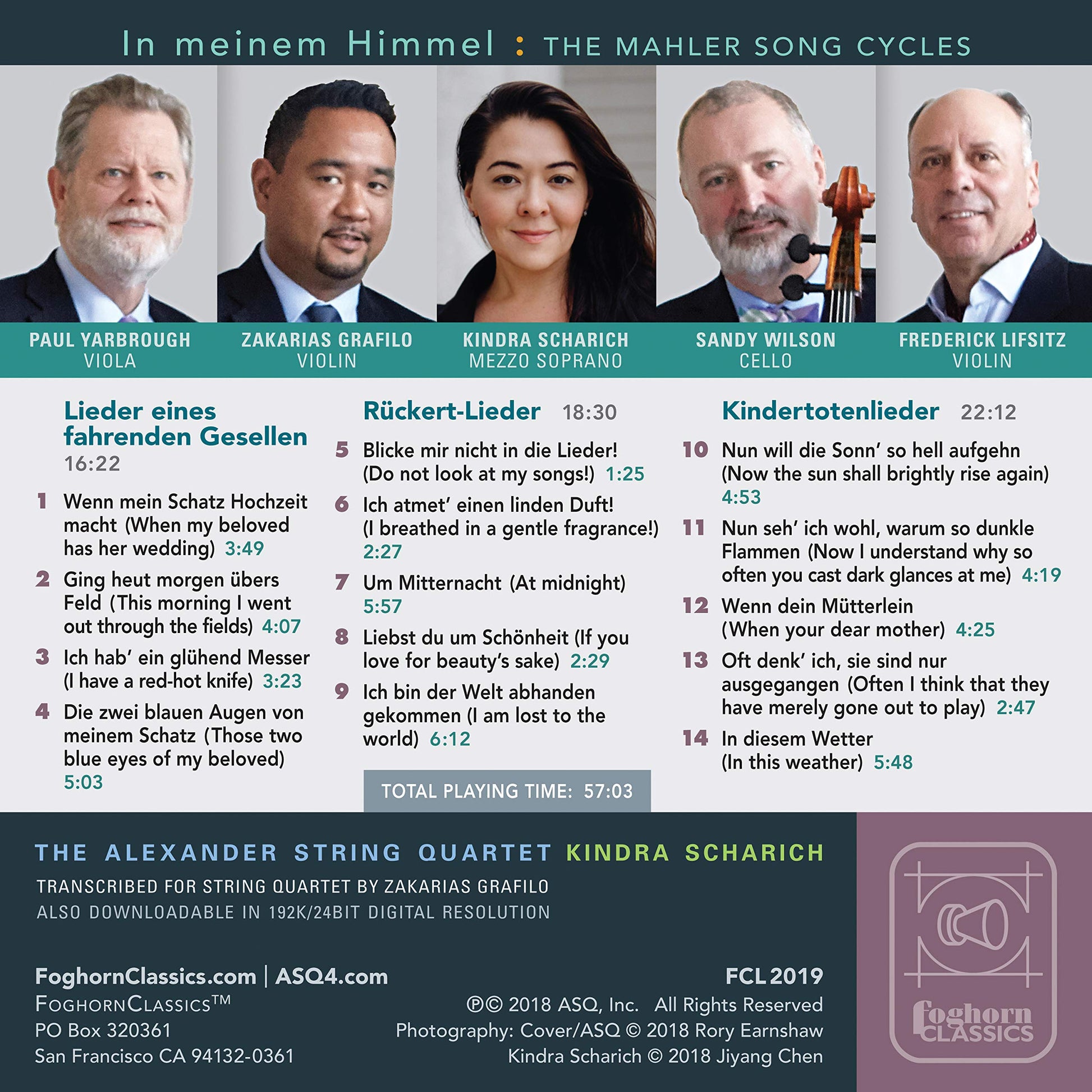 The award-winning Alexander String Quartet joins with acclaimed mezzo soprano Kindra Scharich in this world premiere recording of some of Mahler’s great orchestral Lieder — transcribed for voice and string quartet by Zakarias Grafilo. Commissioned by Lieder Alive! these exquisite transcriptions combine the lushness of the orchestral versions with the intimacy of chamber music — and the result is transcendent. Kindra Scharich has performed more than 50 art songs in 10 languages and sung over 30 roles in the lyric mezzo opera repertoire. Recording projects include Beethoven, Schumann and the complete non-Portuguese song repertoire of the great Brazilian composer Alberto Nepomuceno. A dedicated recitalist with a deep love of chamber music, she has performed and premiered numerous works by living composers. The Alexander String Quartet’s discography includes major cycles by Bartok, Kodaly, Mozart, Shostakovich, and Beethoven. An important advocate of new music, with over 35 commissions and premieres, they have performed on five continents. Directors of the Instructional Program of the Morrison Chamber Music Center at San Francisco State University, ASQ is the subject of an award-winning documentary “Con Moto: The Alexander String Quartet.”