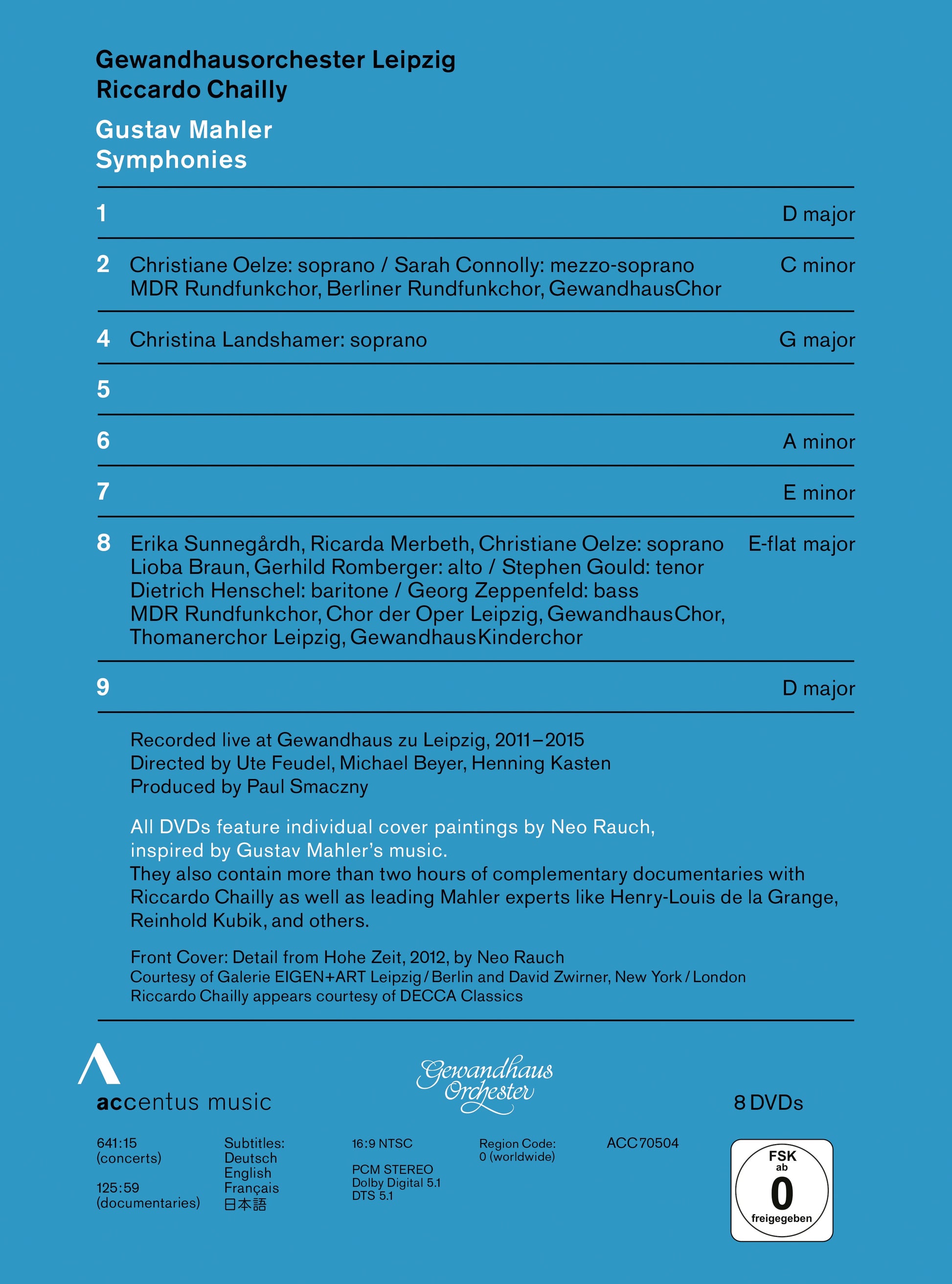 The eight Mahler symphonies contained in this box were all recorded live as part of the Leipzig Mahler cycle that began with the acclaimed Mahler Festival in 2011. They once again confirmed the Gewandhausorchester's reputation as a Mahler reference orchestra, which was consolidated in particular thanks to the intensive examination of Mahler's work under the direction of former Gewandhaus Kapellmeister Riccardo Chailly, who emphasized the compositional qualities of the works, traced the origins of their interpretive history and avoided false pathos and sentimentality despite all the drama and urgency. This becomes clear especially in the more than two hours of documentation material which supplements these exceptional Mahler recordings. In addition to Riccardo Chailly, leading Mahler experts such as Henry-Louis de la Grange and Reinhold Kubik give an insight into Mahler's works and their interpretation. In addition to its musical excellence, the Leipzig Mahler cycle impresses with its graphic design. Each cover of the cycle is adorned with a work by the Leipzig painter Neo Rauch that was inspired by Mahler's music and painted specifically for this cycle.