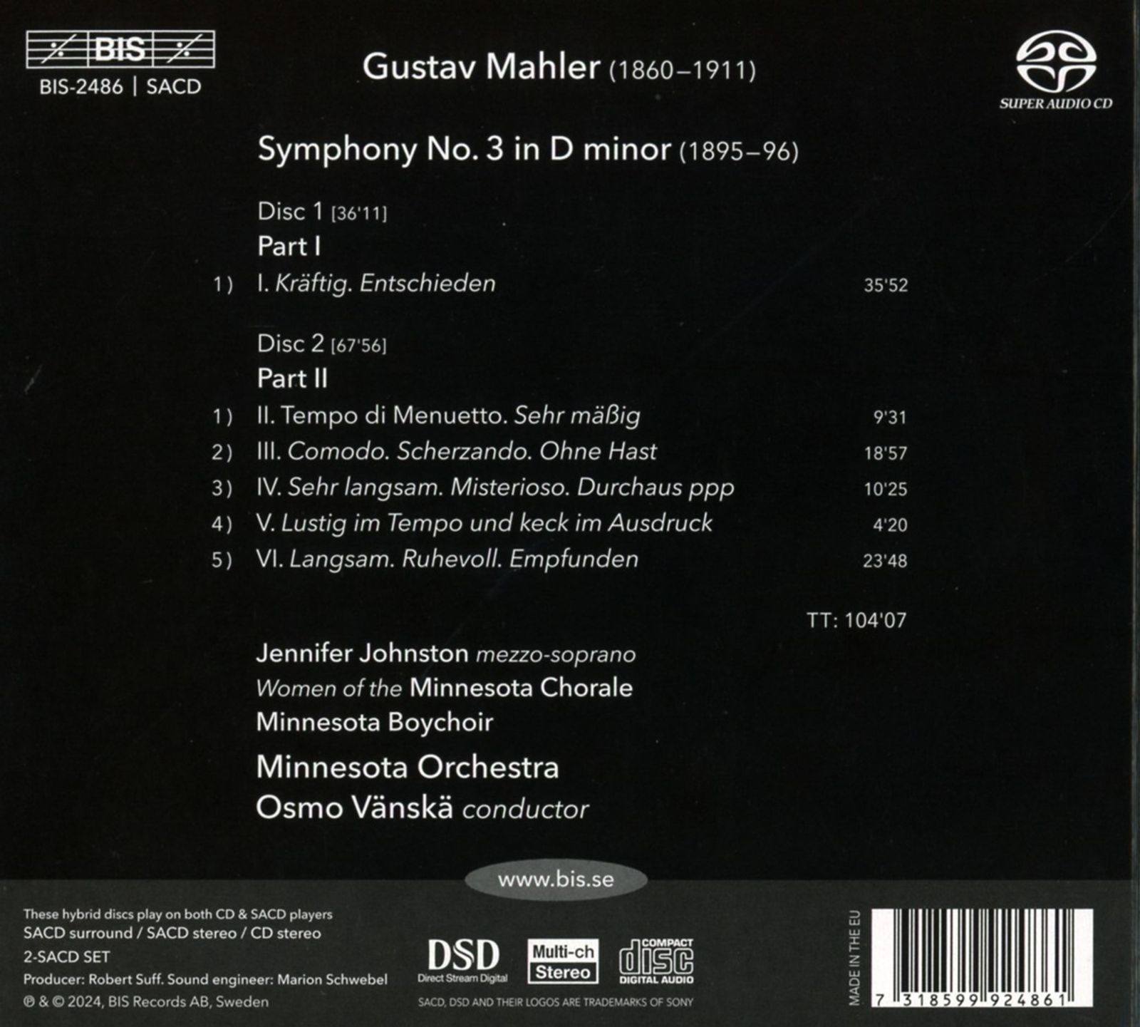 The Minnesota Orchestra and Osmo Vanska bring us Gustav Mahler's Third Symphony, an extraordinary work by any standards. Scored for extended Wagnerian woodwind and brass sections, posthorn, a large array of percussion, women's chorus, alto soloist and boys' choir, the symphony has a duration of over 100 minutes and is filled with extreme emotion, revealing what the composer wanted to say about his own connection with nature and humanity's place in it: 'My symphony will be something the world has never heard before! The whole of nature will have a voice in it...' he wrote about this mammoth work. The recording was made following a concert performance in November 2022. In this musical communion with nature, we hear the beautiful voices of English mezzo-soprano Jennifer Johnston, the Minnesota Boychoir and women of the Minnesota Chorale. The symphony's finale, a deeply absorbing adagio, might simply be some of the most beautiful music ever written. The last work recorded by the Minnesota Orchestra and it's conductor laureate, Osmo Vanska, Mahler's Third Symphony is a fitting culmination to this complete cycle, which began in 2016.