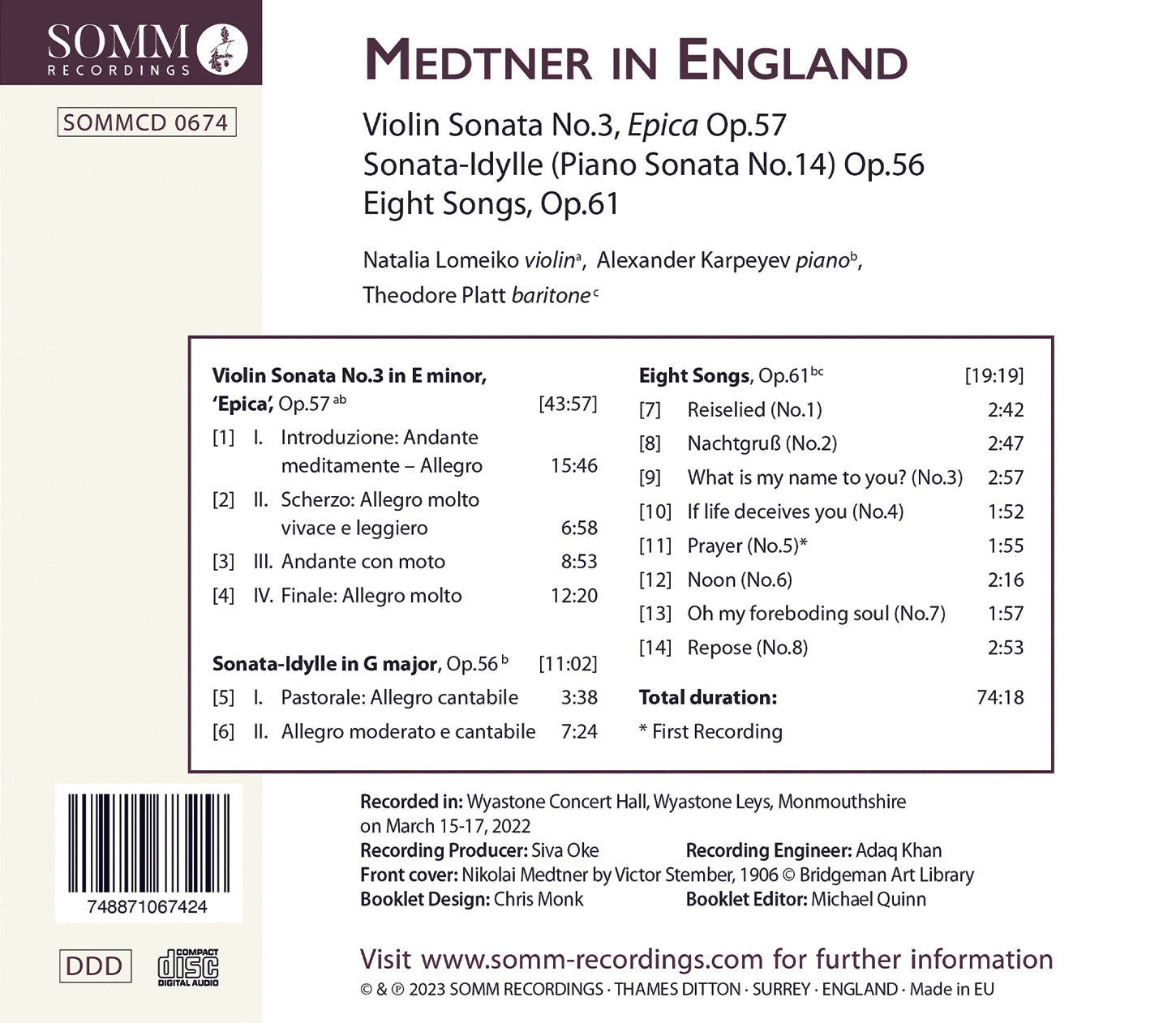 Natalia Lomeiko and Theodore Platt are making their debuts on SOMM Recordings, Alexander Karpeyev’s previous SOMM release, Composers at the Savile Club (SOMMCD 0601), was “a recital eminently worth investigating” said BBC Music Magazine in its five-star review, while MusicWeb International declared it “will be greatly enjoyed”. SOMM’s previous Medtner release, three Piano Sonatas performed by Alessandro Taverna (SOMMCD 0142), received a four-star review from The Guardian, with Gramophone insisting “Make no mistake... this first-class recording... is well worth hearing”.