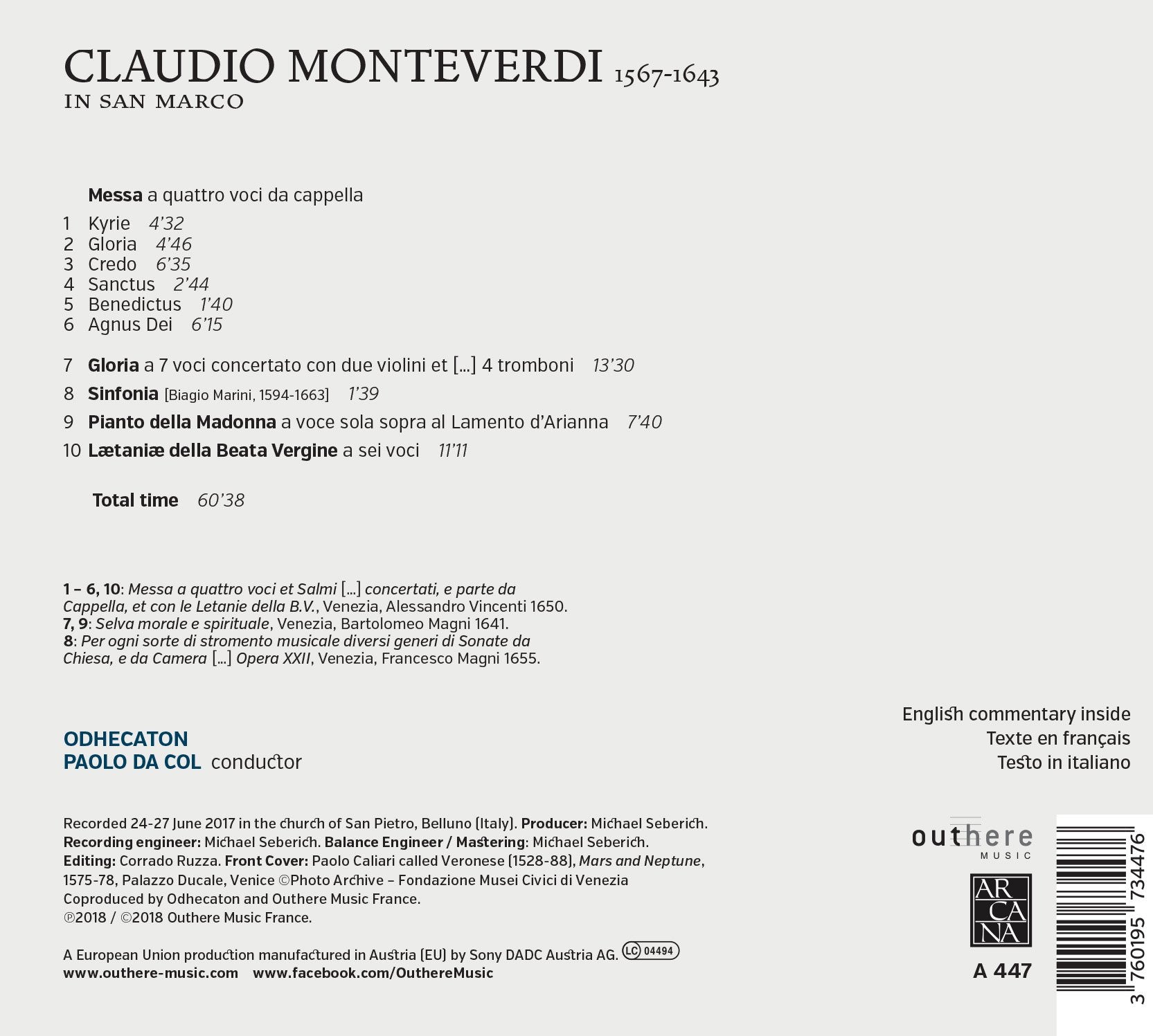Following their album largely devoted to sacred polyphonic works composed for the basilica of Santa Barbara during the period in which Claudio Monteverdi worked for the Gonzagas in Mantua, Odhecaton now presents sacred compositions from the composer’s later years, written for St Mark’s basilica where he became maestro di cappella in 1613. This new recording presents both sides of Monteverdi’s sacred style: the stile antico or strict contrapuntal style, exemplified in the Mass for four voices published posthumously in 1650; and the stile moderno, that is, concertato and solo vocal writing. The concertato style, which combines and intertwines voices and instruments in dialogue, characterizes the monumental Gloria a 7, which was conceived for a cappella rich in virtuoso singers and instrumentalists. But in this city of theaters, in the heyday of the canto a voce sola, Monteverdi transformed the famous Lamento d’Arianna (from his lost opera Arianna) into a sacred piece. The Litanies to the Virgin Mary, published in three collections between 1620 and 1650, represent the expression of a gentle Marian style, dominated by a cappella choral invocations alternating with brief solo passages.