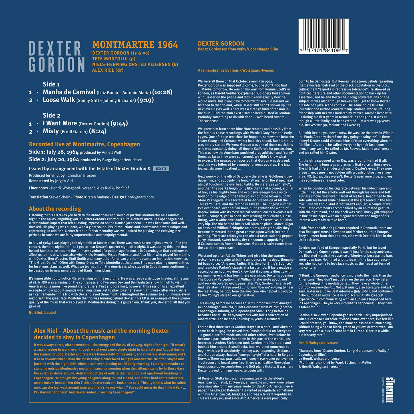 Listening to this album takes you back to the atmosphere and sound of Jazzhus Montmartre on a random night in the 1960s, engulfing you in Dexter Gordons enormous aura. Dexters arrival in Copenhagen had a tremendous impact that left a lasting impression on the Danish jazz scene. He was handsome and well-dressed. His playing was superb, with a giant sound; his introductions and showmanship were unique and captivating. In addition, Dexter felt the Danish mentality was well-suited for playing and enjoying jazz. It was always there, Alex Riel remembers It wasnt a case of going to work, even though we played every, single night in June, July and August during the summer of 1964. Dexter and Tete were there solely for the music, and so were Niels-Henning and I. It is so obvious when I hear the music today. Dexter loved being in Montmartre. He often stayed and jammed with the night shift when it took over, playing on till early morning And Dexter ended up owning Copenhagen!