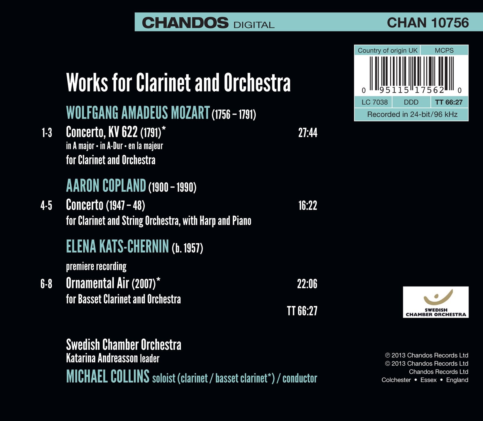 Michael Collins combines the roles of clarinet soloist and conductor as he leads the Swedish Chamber Orchestra in three works that chart the journey of the clarinet from Mozart’s late eighteenth-century Europe, via Aaron Copland’s 1940s America, to today’s classical scene with a piece written, for Michael Collins, in 2007 by the Australian composer Elena Kats-Chernin.