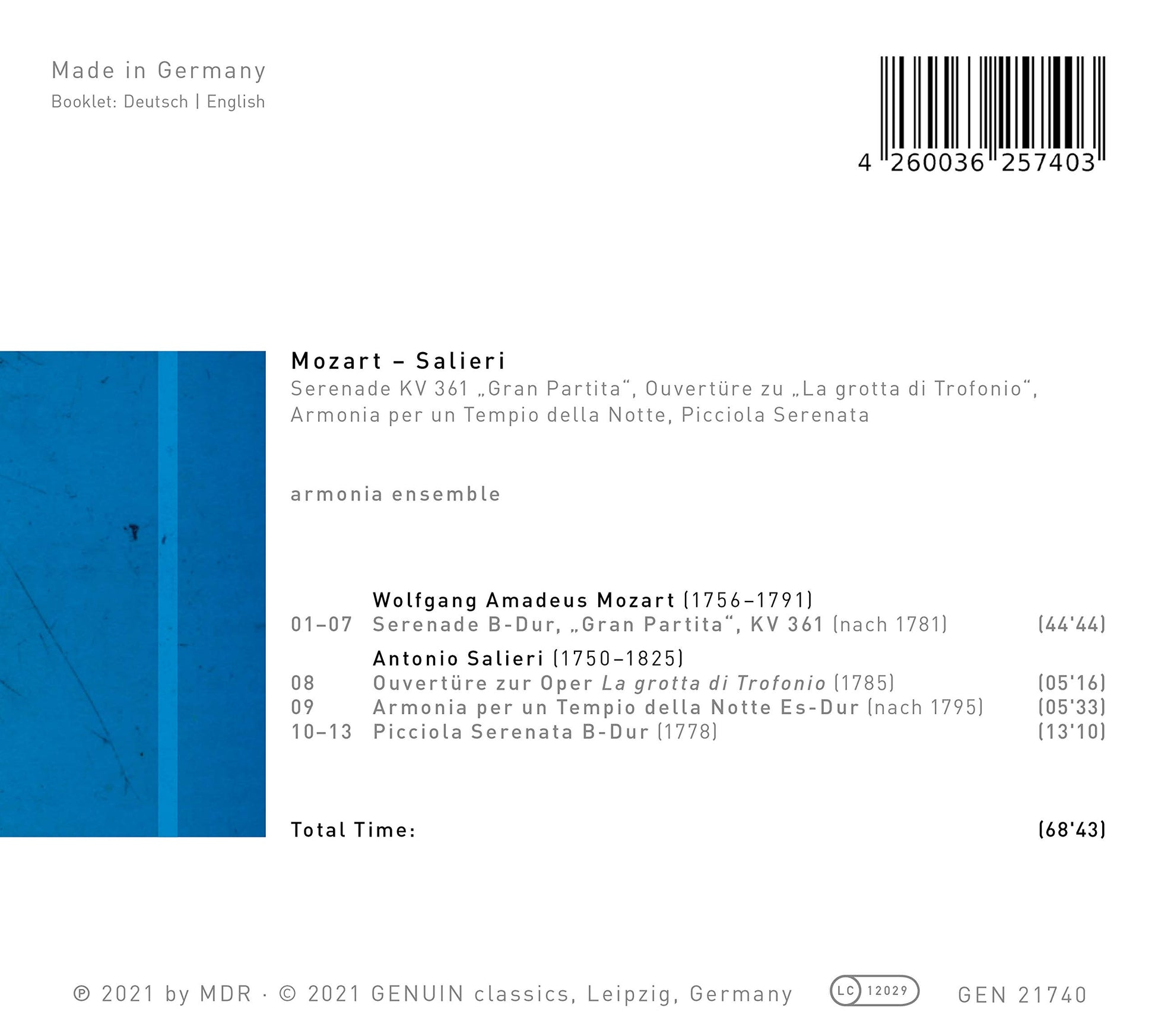 The armonia ensemble, made from the ranks of the Gewandhaus Orchestra and the MDR Symphony Orchestra wind sections, dishes up a veritable explosion of sound on their new GENUIN release. At the heart of their exploration of Harmoniemusik, music for an ensemble of woodwinds, horns, and double bass, is Mozart's "Gran Partita," the opus ultimum of the genre. In addition, the elite wind players allow us to discover three works by Salieri, whose material was crafted just for them: An opera overture, an "Armonia per un tempio della notte,” and a "Piccola Serenata." The armonia ensemble produces a dense, historically informed sound that beautifully showcases the splendor of these four extraordinary works.