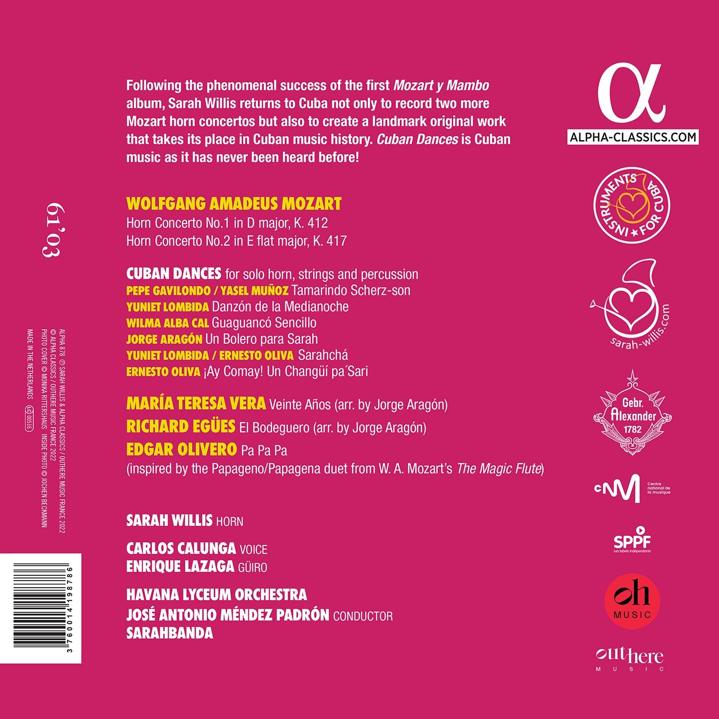 Following the phenomenal success of the first Mozart y Mambo album, Sarah Willis returns to Cuba not only to record two more Mozart horn concertos but also to create a landmark original work that takes its place in Cuban music history. In Mozart y Mambo - Cuban Dances, Sarah commissions the very first Cuban horn concerto – calling on six young talented Cuban composers to each write an original dance for solo horn, strings, and percussion inspired by the most famous dance rhythms from across different regions of Cuba. Together with her beloved Havana Lyceum Orchestra conducted by José Antonio Méndez Padrón, Sarah takes us on a cross country musical road trip in this spectacular showcase of the roots and traditions of Cuba’s music and dance. Cuban Dances is Cuban music as it has never been heard before and a huge challenge for the horn player, not only technically but physically – “if you can’t dance it you can’t play it” she was told. So dance it she did! Mozart y Mambo - Cuban Dances is full of magic, energy, and passion, and Sarah’s love for Cuban music is evident in every track.