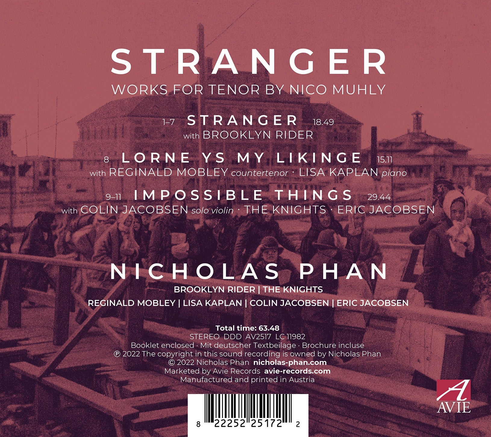 Composer Nico Muhly has been on concert bills all over the U.S. and beyond in the early 2020s, and one reason is that he has a knack for creating music for the right performer at the right time. Tenor Nicholas Phan is a rising star who here contributes an essay about his difficulties, when performing at the Singer of the World competition in Wales, in coming up with a song that reflected his "American" identity, inasmuch as he is Chinese Indonesian on one side, and Greek American on the other. He would have found the perfect solution in Muhly's seven-section Stranger, for voice and string quartet. Muhly, himself the product of a highly multi-ethnic background, sets writing about the experience of immigration from various sources, including an interview with a Sicilian woman who arrived at Ellis Island in 1911 and a letter from a Chinese American about discrimination. All are in different registers, and Muhly's sensitive handling of text adds variety even as his musical language remains consistent. Phan's commitment to these pieces is palpable, but he shifts gears effectively in the other works on the program, Lorne Ys My Likinge, a setting of the Chester Mystery Play inspired by Britten's Abraham and Isaac, and Impossible Things, which sets translated texts by poet C.P. Cavafy. Phan's duet work with countertenor Reginald Mobley in Lorne Ys My Likinge is absolutely delicious, and the accompaniment by the string quartet Brooklyn Rider and the New York chamber orchestra The Knights, is intimate and close. This marks a major step forward for Phan, and anyone who hasn't been following Muhly's music, which combines rigor with tremendous audience appeal (sample the ravishing "My Love" from Stranger), might do well to start here.