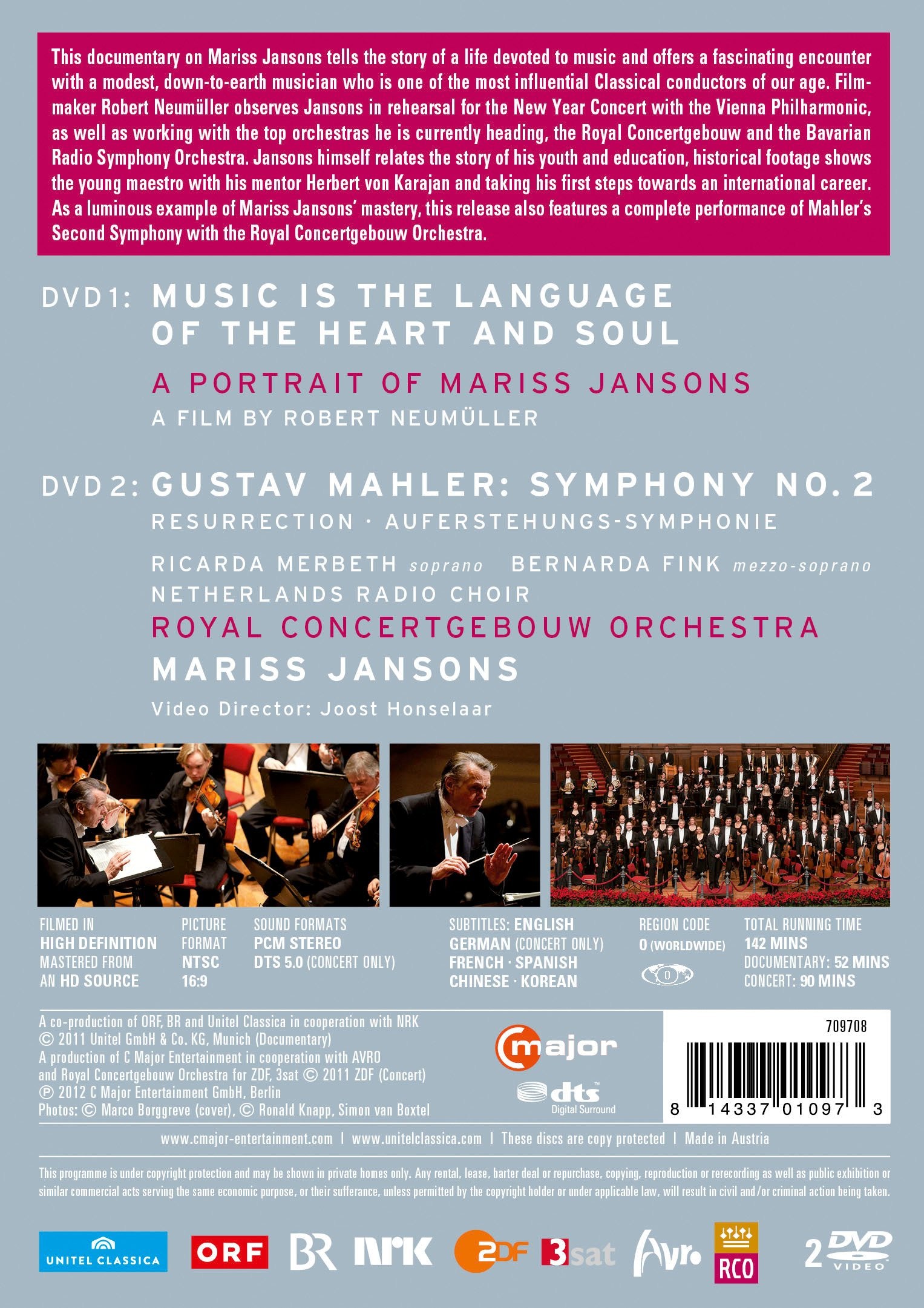Mariss Jansons is one of the most influential conductors of our age. In 2012 the charismatic Latvian musician conducted his second New Year Concert in Vienna, an honour that very few conductors have enjoyed. For the present documentary portrait, the film maker Robert Neumüller observed Jansons at work in Amsterdam, Riga, St Petersburg, Vienna and Salzburg. The film shows Jansons working with his various orchestras, including rehearsals for the 2012 New Year Concert, and also explores his private life, resulting in a number of fascinating insights into Jansons’ artistic development and philosophy. By way of a bonus, this release features a complete performance of Mahler’s Second Symphony with the Royal Concertgebouw Orchestra under Mariss Jansons.