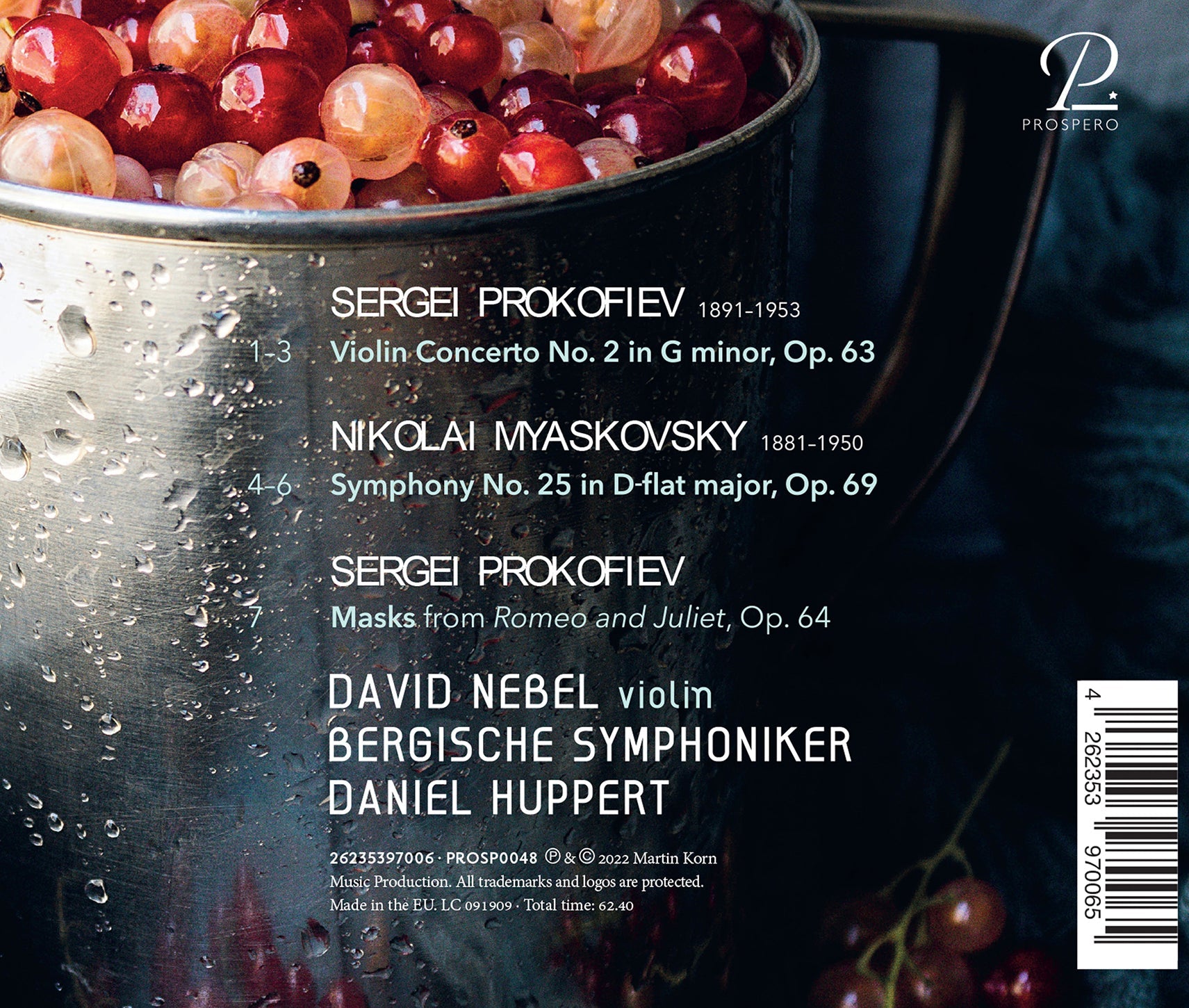 It is an interesting program that Daniel Huppert and the Bergische Symphoniker have presented here. The 2nd Violin Concerto by Sergei Prokofiev (soloist: David Nebel), is combined with the Symphony No. 25 by Nikolai Myaskovsky. The program is completed by the arrangement of the piece "Masks" from Prokofiev's ballet "Romeo and Juliet" for violin and orchestra, made especially for this recording. David Nebel is in demand as a soloist, combining technical brilliance with mature musicality and an unmistakable tone. Highlights of past seasons include performances and recordings with the Cape Town Philharmonic Orchestra, the Xiamen Philharmonic Orchestra, Orchestre Royal Philharmonique de Liège and the Lithuanian National Philharmonic. David performed as soloist with the Baltic Sea Philharmonic under Kristjan Järvi at the Finlandia Concert Hall (Helsinki), the Mariinsky Theatre 2 (St. Petersburg) and the Estonia Concert Hall (Tallinn). With the London Symphony Orchestra, Nebel and Järvi recorded together at the famous Abbey Road Studios in London.