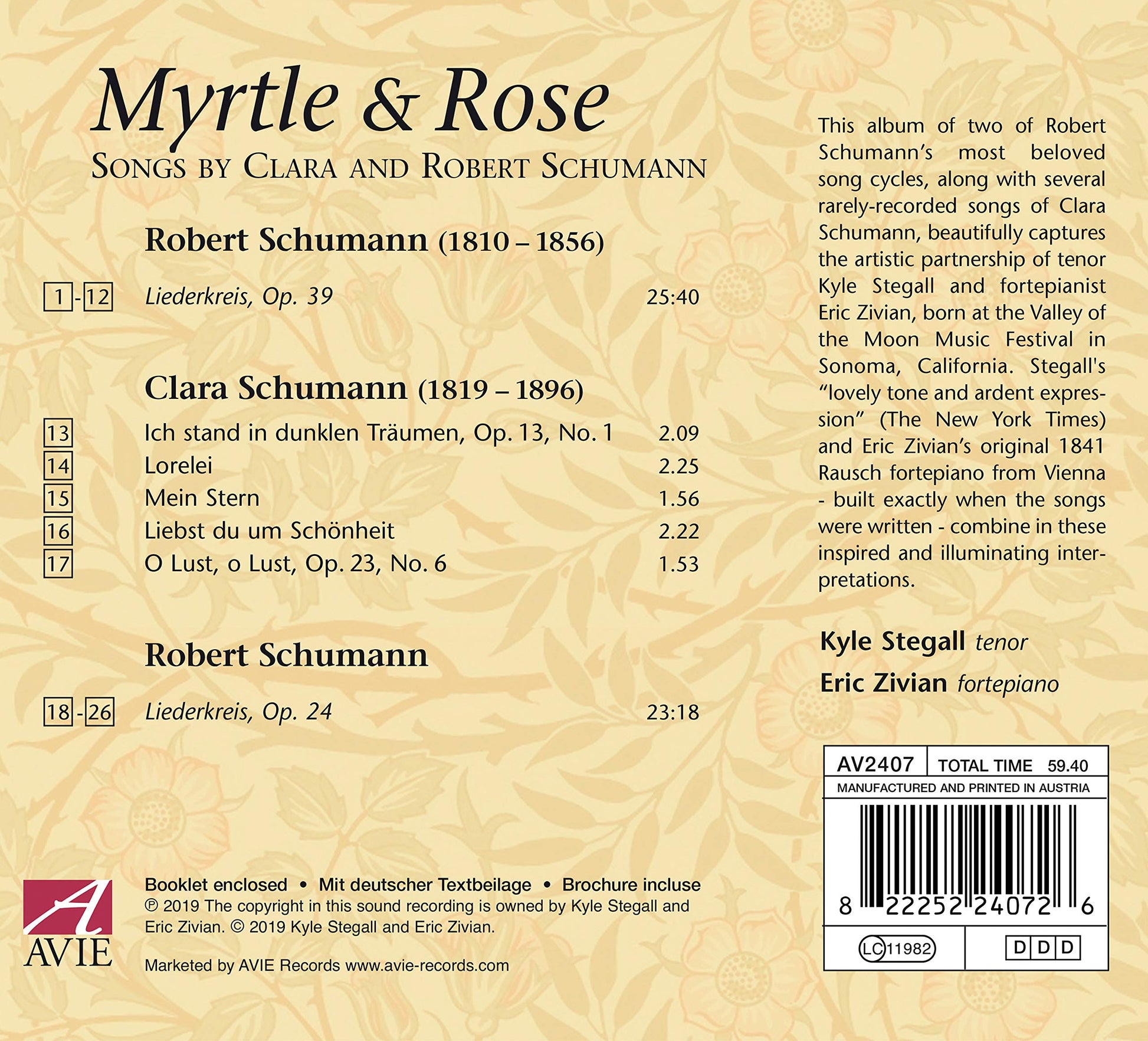 Myrtle and Rose- the title taken from the Heinrich Heine poem which Robert Schumann set as the final song of his Liederkreis, Op. 24- features two of Robert Schumann’s most beloved song cycles (the other being Liederkreis, Op. 39) along with several rarely-recorded songs by his wife Clara. The album beautifully captures the artistic partnership of tenor Kyle Stegall and fortepianist Eric Zivian, who first collaborated at the Valley of the Moon Music Festival in Sonoma, California. Stegall’s “lovely tone and ardent expression” (The New York Times) and Eric Zivian’s original 1841 Rausch fortepiano from Vienna- built exactly when the songs were written- combine in these inspired and illuminating interpretations. “a gentle tone that melted the hearts of all” (OperaWire) “the last word in low key virtuosity” (San Francisco Classical Voice)