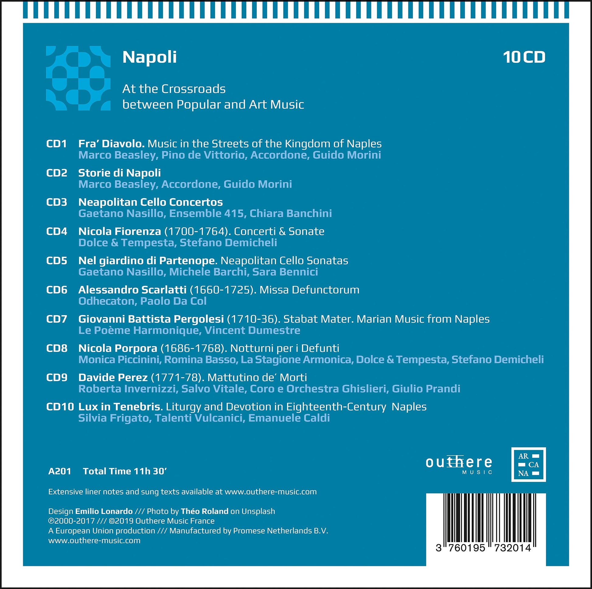 “I’m leaving. I shall not forget via Toledo nor all the other districts in Naples. To my eyes it is incomparable, the most beautiful city in the world.” Stendhal Stendhal describes the Naples we love. The Naples of myriad colors and scents, with its wealth of different music. This set of 10 albums provides an original overview of Neapolitan music of the 18th century, the music that was played and sung in the great houses, the churches and the streets of the city. It is a chance to rediscover forgotten or long-neglected repertoires: a vast musical heritage of instrumental and sacred music, first and foremost, but also folk music, magnificently brought back to life by Marco Beasley, Pino De Vittorio and Guido Morini in Fra’ Diavolo and Storie di Napoli, two iconic albums which appear here together for the first time. The set also features other outstanding musicians of international repute, many of them specialized in this particular repertoire: Roberta Invernizzi, Monica Piccinini, Silvia Frigato, Romina Basso, Salvo Vitale, the Ghislieri Choir and Orchestra (Giulio Prandi), Talenti Vulcanici, Dolce & Tempesta (Stefano Demicheli) and Odhecaton (Paolo Da Col).