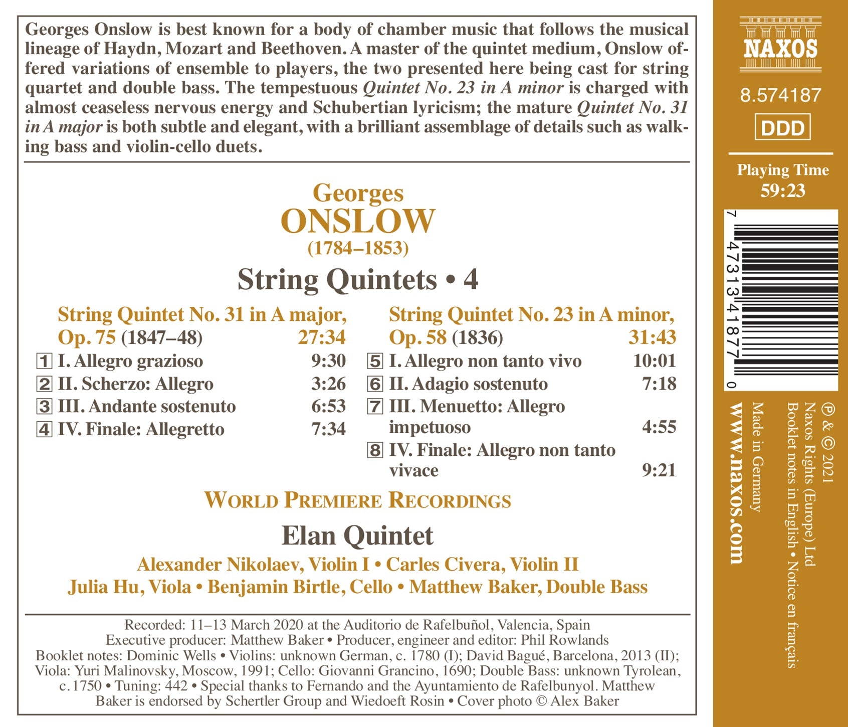 Georges Onslow is best known for a body of chamber music that follows the musical lineage of Haydn, Mozart and Beethoven. A master of the quintet medium, Onslow offered variations of ensemble to players, the two presented here being cast for string quartet and double bass. The tempestuous Quintet No. 23 in A minor is charged with almost ceaseless nervous energy and Schubertian lyricism; the mature Quintet No.31 in A major is both subtle and elegant, with a brilliant assemblage of details such as walking bass and violin-cello duets.