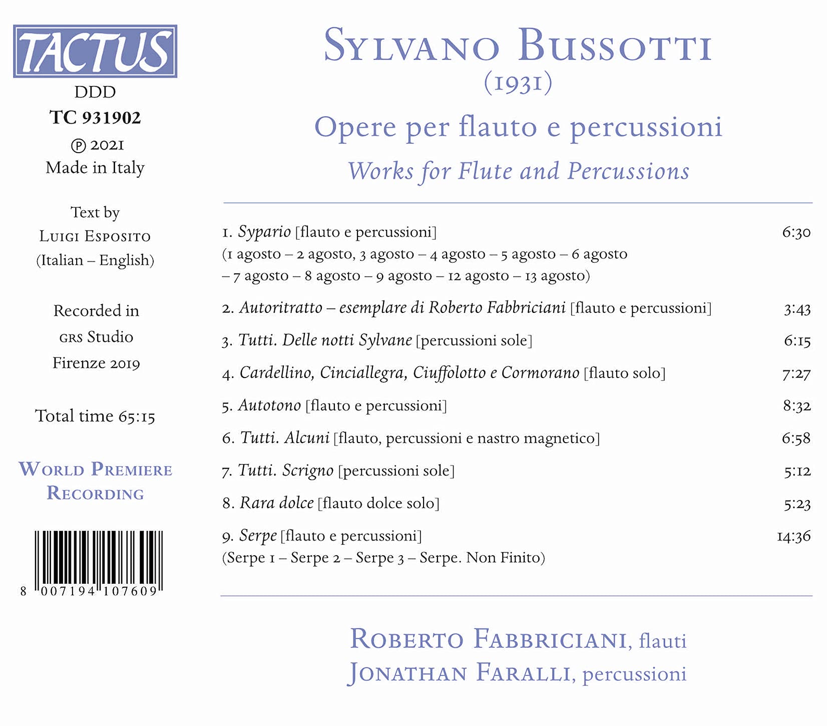 In the month of what would have been his ninetieth birthday, this record comes as a tribute to Sylvano Bussotti. One of the most singular and emblematic composers on the international contemporary classical scene, Bussotti passed away in September 2021. This music comes to us thanks to Jonathan Faralli on percussion and Roberto Fabbriciani on flute, an equally emblematic performer and constant point of reference in the musical production of our century, as well as a great friend and close collaborator of Bussotti himself. A must-have for lovers of the genre as well as the curious newcomer, the album offers masterful work by the two performers as they stage Bussotti's famously theatrical scores, full of dramaturgy, poetry and scenography for both eyes and ears.